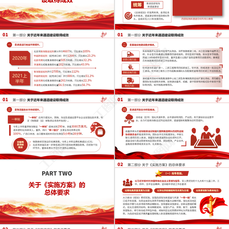<p>匯報(bào)人:xxx2021年"十四五"推進(jìn)西部陸海新通道高質(zhì)量建設(shè)實(shí)施方案</p><br><p>前 言 為深入貫徹落實(shí)黨中央、國(guó)務(wù)院決策部署,更大力度推進(jìn)《西部陸海新通道總體規(guī)劃》(以下簡(jiǎn)稱《規(guī)劃》)實(shí)施,高水平共建西部陸海新通道,根據(jù)《中華人民共和國(guó)國(guó)民經(jīng)濟(jì)和社會(huì)發(fā)展第十四個(gè)五年規(guī)劃和 2035 年遠(yuǎn)景目標(biāo)綱要》,制定本實(shí)施方案。 近日,國(guó)家發(fā)展改革委印發(fā)《“十四五”推進(jìn)西部陸海新通道高質(zhì)量建設(shè)實(shí)施方案》,《實(shí)施方案》堅(jiān)持問(wèn)題導(dǎo)向和目標(biāo)導(dǎo)向,從加快推進(jìn)主通道建設(shè)、強(qiáng)化重要樞紐功能、提高通道運(yùn)輸組織與物流效率、推動(dòng)通道降低成本和優(yōu)化服務(wù)、構(gòu)建通道融合開(kāi)放發(fā)展新局面等方面做出具體部署,具有很強(qiáng)的指導(dǎo)性和針對(duì)性,是“十四五”期間高質(zhì)量推進(jìn)西部陸海新通道建設(shè)的綱領(lǐng)性文件。</p><br><p>目錄CONTENTS</p><br><p>PART ONE關(guān)于近年來(lái)通道建設(shè)取得成效</p><br><p>《總體規(guī)劃》印發(fā)兩年來(lái),各項(xiàng)任務(wù)有序推進(jìn),通道建設(shè)保持強(qiáng)勁增長(zhǎng)勢(shì)頭,全面實(shí)現(xiàn)2020年發(fā)展目標(biāo)。西部陸海新通道空間布局示意圖刪除紅色色塊有圖片</p><br><p>2020年是通道運(yùn)行效益不斷提升。洋浦港完成集裝箱吞吐量56.5萬(wàn)標(biāo)箱,同比增長(zhǎng)56.7%北部灣鐵海聯(lián)運(yùn)班列累計(jì)開(kāi)行4607列,同比增長(zhǎng)105%中越跨境班列(經(jīng)憑祥口岸)開(kāi)行1264列、同比增長(zhǎng)23.2%北部灣港完成集裝箱吞吐量505萬(wàn)標(biāo)箱,同比增長(zhǎng)32.2%洋浦港完成集裝箱吞吐量102萬(wàn)標(biāo)箱,同比增長(zhǎng)43.9%2021上半年鐵海聯(lián)運(yùn)班列開(kāi)行2705列,同比增長(zhǎng)112%中越跨境班列(經(jīng)憑祥口岸)開(kāi)行886列,同比增長(zhǎng)51.2%北部灣港完成集裝箱吞吐量261萬(wàn)標(biāo)箱,同比增長(zhǎng)22.3%</p><br><p>欽州港東航道擴(kuò)建一、二期工程等項(xiàng)目如期竣工,欽州港、防城港港一批泊位開(kāi)工建設(shè)。欽州港三墩東20萬(wàn)噸級(jí)集裝箱碼頭及配套航道等項(xiàng)目前期工作加快推進(jìn)。是基礎(chǔ)設(shè)施建設(shè)穩(wěn)步推進(jìn)。焦柳鐵路懷化至柳州段電氣化改造、渝懷鐵路增建二線、水口至馱隆中越界河二橋、樂(lè)業(yè)至百色高速公路等項(xiàng)目建成投用,貴陽(yáng)至南寧鐵路、敘永至畢節(jié)鐵路、國(guó)道219防城峒中至東興段、重慶至遵義公路擴(kuò)容改造等項(xiàng)目進(jìn)展順利,黃桶至百色鐵路等項(xiàng)目前期工作加快推進(jìn)。建成重慶團(tuán)結(jié)村鐵路集裝箱中心站二期及魚嘴鐵路貨運(yùn)站擴(kuò)建北場(chǎng)站、貴陽(yáng)都拉營(yíng)國(guó)際陸海通物流港等,加快建設(shè)重慶、成都、遂寧國(guó)家物流樞紐及中新南寧國(guó)際物流園、柳州鐵路港等項(xiàng)目。</p><br><p>今年上半年重慶鐵海聯(lián)運(yùn)“一單制”提單達(dá)到290單、貨值3080萬(wàn)美元。通關(guān)便利化持續(xù)深入,重慶、四川“單一窗口”主要業(yè)務(wù)應(yīng)用率達(dá)到100%,廣西口岸進(jìn)、出口整體通關(guān)時(shí)間分別降至5小時(shí)和28分鐘。是物流服務(wù)水平持續(xù)提升。鐵路繼續(xù)實(shí)施運(yùn)價(jià)優(yōu)惠政策,今年上半年運(yùn)費(fèi)優(yōu)惠超過(guò)1億元;北部灣港落實(shí)進(jìn)一步降低港口中介服務(wù)收費(fèi)激勵(lì)政策,目前除個(gè)別環(huán)節(jié)外,整體收費(fèi)水平已與寧波舟山港相當(dāng)。“一單制”應(yīng)用力度加大,國(guó)鐵、海運(yùn)及通道運(yùn)營(yíng)平臺(tái)企業(yè)加強(qiáng)信息共享,制定《鐵路提(運(yùn))單融資業(yè)務(wù)技術(shù)指南》。一單制</p><br><p>由重慶牽頭的省際聯(lián)席會(huì)議制度和國(guó)鐵集團(tuán)牽頭的班列運(yùn)輸協(xié)調(diào)委員會(huì)積極發(fā)揮作用。國(guó)際合作交流拓展深化,中新互聯(lián)互通項(xiàng)目深入推進(jìn),首屆陸海新通道國(guó)際論壇順利召開(kāi),通道沿線與周邊國(guó)家和地區(qū)國(guó)際貿(mào)易、國(guó)際物流、產(chǎn)業(yè)合作、金融服務(wù)等領(lǐng)域務(wù)實(shí)合作、扎實(shí)推動(dòng)。是通道開(kāi)放合作積極推進(jìn)。沿線省(區(qū)市)強(qiáng)化共建共享,合作建設(shè)物流園、產(chǎn)業(yè)園,共同建設(shè)綜合運(yùn)營(yíng)平臺(tái),合力打造鐵海聯(lián)運(yùn)班列運(yùn)輸品牌,通道輻射和集聚效應(yīng)明顯提升。</p><br><p>PART TWO關(guān)于《實(shí)施方案》的總體要求</p><br><p>大力推動(dòng)《規(guī)劃》貫徹實(shí)施,加強(qiáng)西部陸海新通道與共建“一帶一路”和長(zhǎng)江經(jīng)濟(jì)帶發(fā)展、海南全面深化改革開(kāi)放等區(qū)域重大戰(zhàn)略對(duì)接,強(qiáng)化成渝地區(qū)雙城經(jīng)濟(jì)圈與北部灣城市群戰(zhàn)略聯(lián)動(dòng),加快基礎(chǔ)設(shè)施建設(shè),創(chuàng)新運(yùn)營(yíng)組織模式,優(yōu)化交通物流結(jié)構(gòu),推動(dòng)降碳減排,加強(qiáng)與產(chǎn)業(yè)、貿(mào)易、