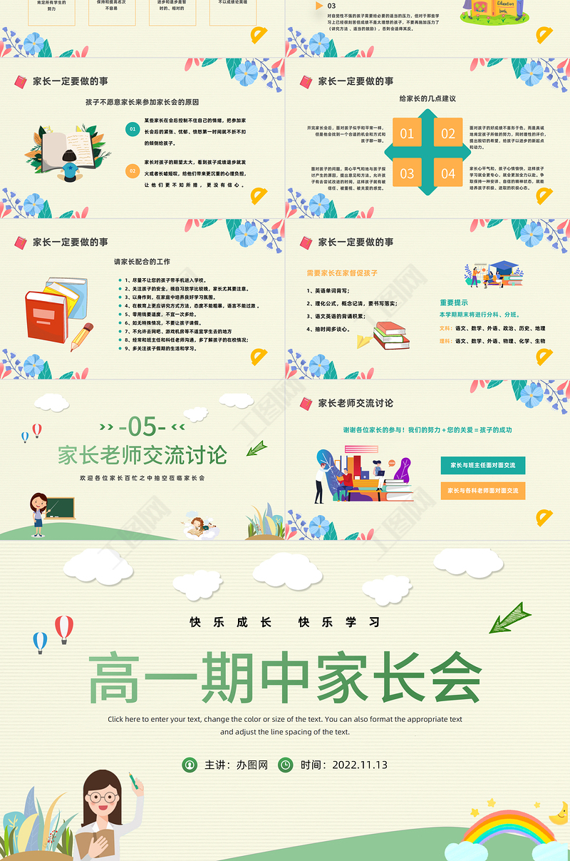 工圖網(wǎng)提供2022高一期中家長(zhǎng)會(huì)PPT卡通風(fēng)高中期中家長(zhǎng)會(huì)主題班會(huì)課件模板供會(huì)員免費(fèi)下載。更多精彩黨課PPT素材,盡在工圖網(wǎng)。
