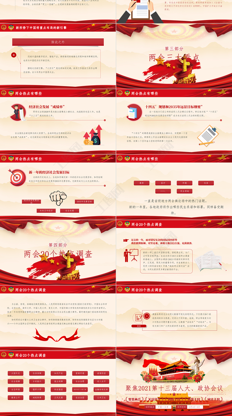 工圖網(wǎng)提供紅色 黨政風(fēng)大氣聚焦2021第十三屆人大政協(xié)會議奮進(jìn)新征程PPT供會員免費(fèi)下載。更多精彩黨課PPT素材,盡在工圖網(wǎng)。