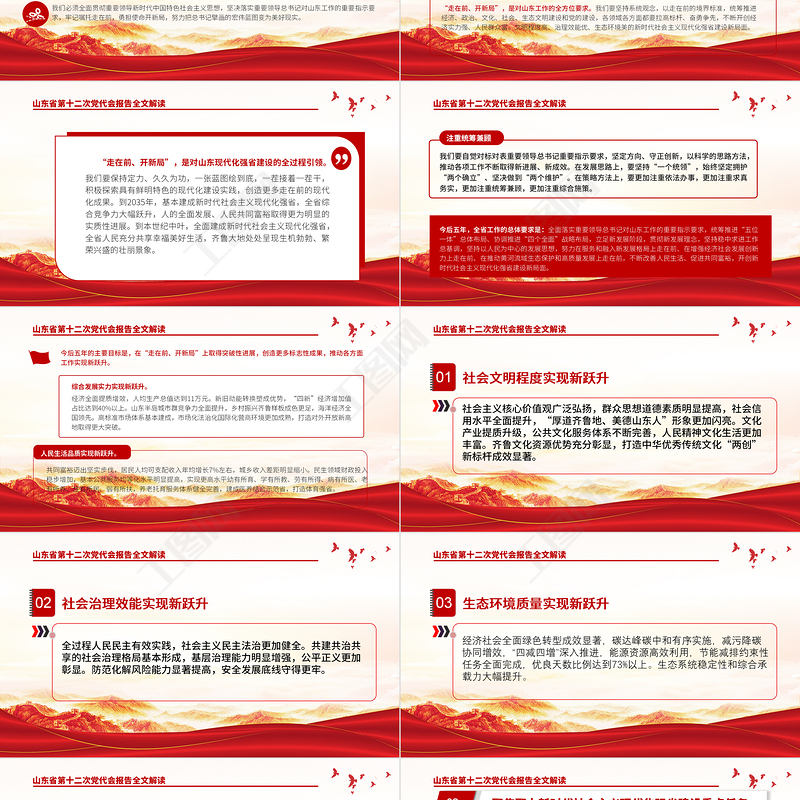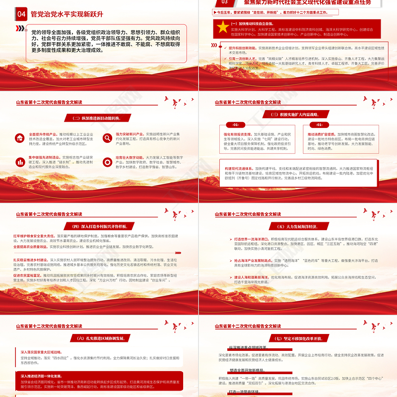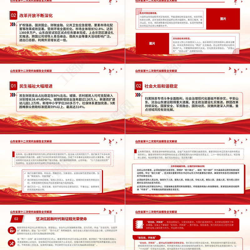山東省第十二次黨代會報告全文解讀01深刻領(lǐng)會“兩個確立”的決定性意義,增強“四個意識”、堅定“四個自信”、做到“兩個維護”,傳承發(fā)揚黨的百年奮斗歷史經(jīng)驗,與時俱進完善思路舉措。從“八大發(fā)展戰(zhàn)略”“九大改革攻堅”“十強現(xiàn)代優(yōu)勢產(chǎn)業(yè)”“七個走在前列”“九個強省突破”,到“六個一”發(fā)展思路、“六個更加注重”策略方法、“十二個著力”重點任務(wù)。在繼承中發(fā)展、在創(chuàng)新中提升,順利完成省第十一次黨代會確定的主要任務(wù),如期打贏脫貧攻堅戰(zhàn),如期全面建成小康社會,各項工作邁上新臺階。省第十一次黨代會以來的五年,是山東發(fā)展史上極不平凡的五年。重要領(lǐng)導(dǎo)總書記三次親臨視察,多次發(fā)表重要講話、作出重要指示批示,為山東發(fā)展把舵領(lǐng)航、指引方向。我們牢記總書記囑托,堅持以重要領(lǐng)導(dǎo)新時代中國特色社會主義思想為指導(dǎo),全面貫徹黨的十九大和十九屆歷次全會精神。