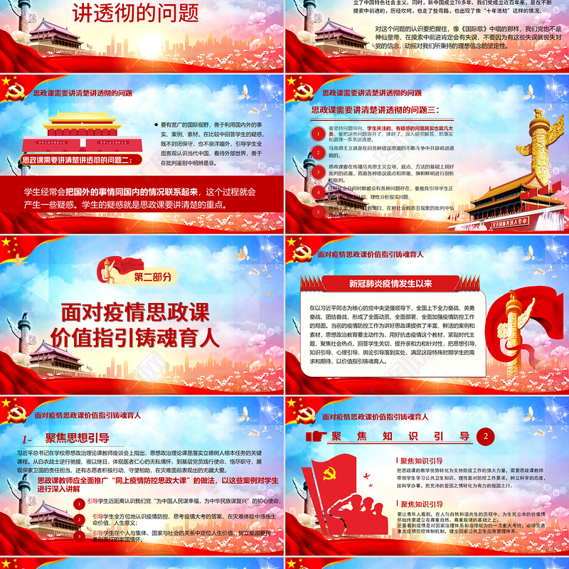 面對疫情思政課價值指引鑄魂育人聚焦思想引導1-在學校思想政治理論課教師座談會上指出,思想政治理論課是落實立德樹人根本任務的關鍵課程。從白衣戰士逆行馳援、夜以繼日,體現醫者仁心的無私情懷,到基層黨員踐行使命、恪盡職守,展現保家衛國的責任擔當,還有志愿者積極行動、守望相助,在災難面前表現出的無疆大愛。思政課教師應全面推廣“同上疫情防控思政大課”的做法,以這些案例對學生進行深入講解1引導學生近距離認識我們黨“為中國人民謀幸福,為中華民族謀復興”的初心使命;2引導學生全方位地認識疫情防控,思考疫情大考的答案,在災難體驗中感悟生命價值、人生意義;3引導學生在個人與集體、國家與社會的關系中定位人生價值,樹立愛國愛民、勇擔責任的家國情懷。