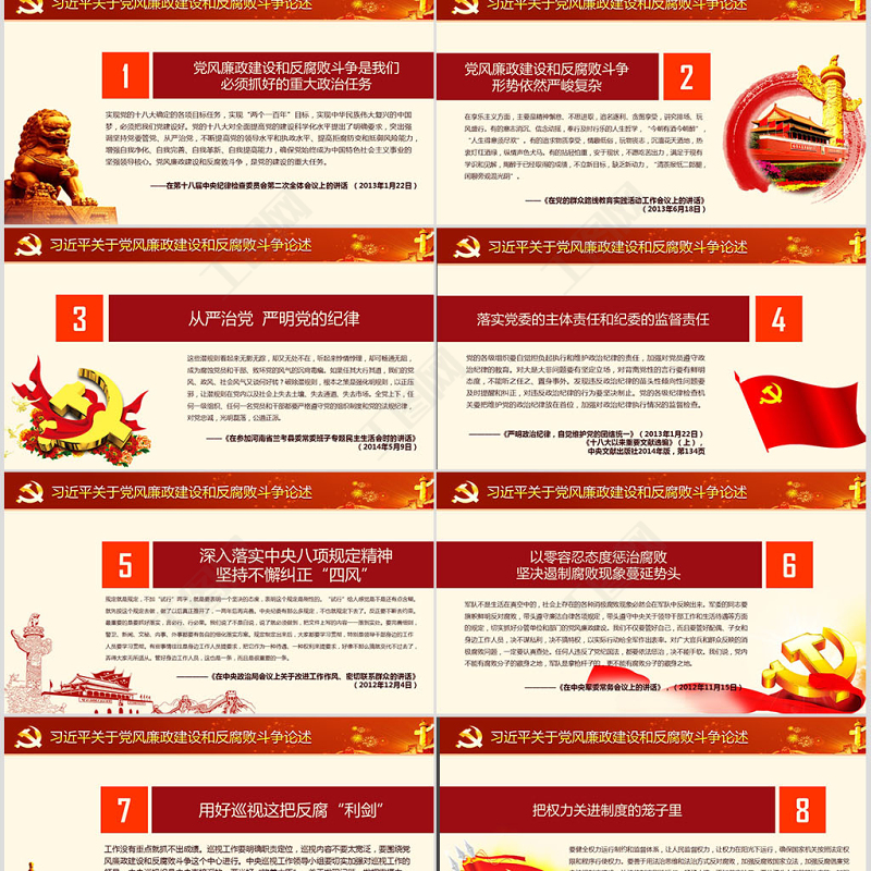 關于黨風廉政建設和反腐敗斗爭論述1黨風廉政建設和反腐敗斗爭是我們必須抓好的重大政治任務實現黨的十八大確定的各項目標任務,實現“兩個一百年”目標,實現中華民族偉大復興的中國夢,必須把我們黨建設好。黨的十八大對全面提高黨的建設科學化水平提出了明確要求,突出強調堅持黨要管黨、從嚴治黨,不斷提高黨的領導水平和執政水平、提高拒腐防變和抵御風險能力,增強自我凈化、自我完善、自我革新、自我提高能力,確保黨始終成為中國特色社會主義事業的堅強領導核心。黨風廉政建設和反腐敗斗爭,是黨的建設的重大任務?!诘谑藢弥醒爰o律檢查委員會第二次全體會議上的講話 (2013年1月22日)