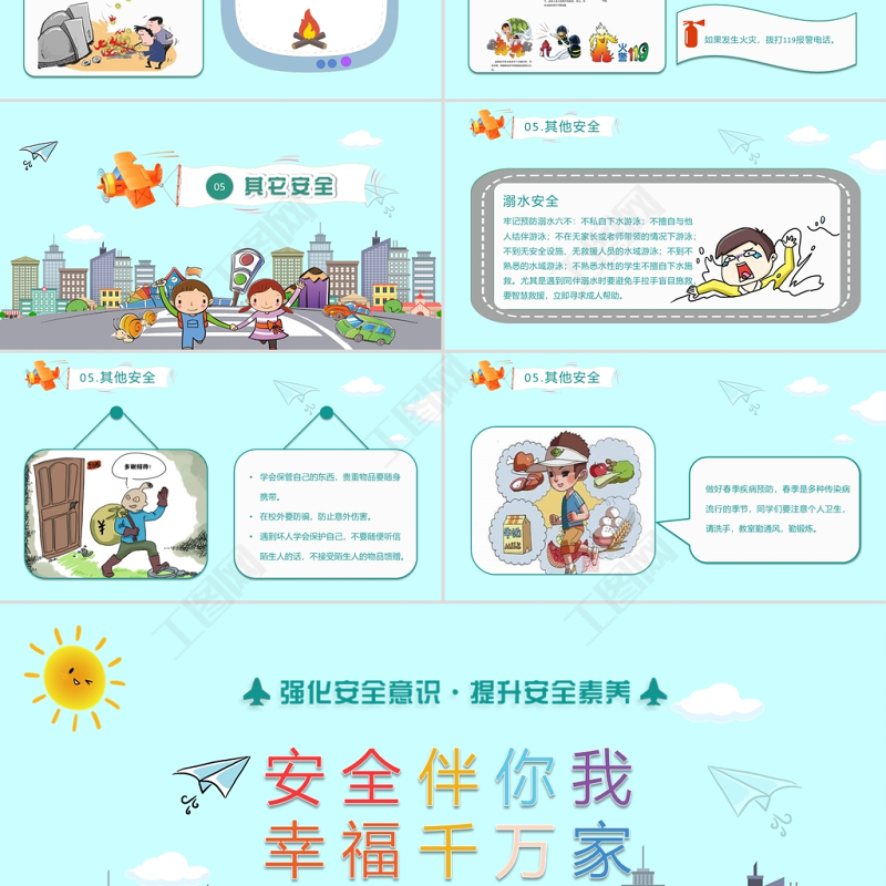 05.其他安全牢記預防溺水六不:不私自下水游泳;不擅自與他人結伴游泳;不在無家長或老師帶領的情況下游泳;不到無安全設施、無救援人員的水域游泳;不到不熟悉的水域游泳;不熟悉水性的學生不擅自下水施救。尤其是遇到同伴溺水時要避免手拉手盲目施救,要智慧救援,立即尋求成人幫助。溺水安全