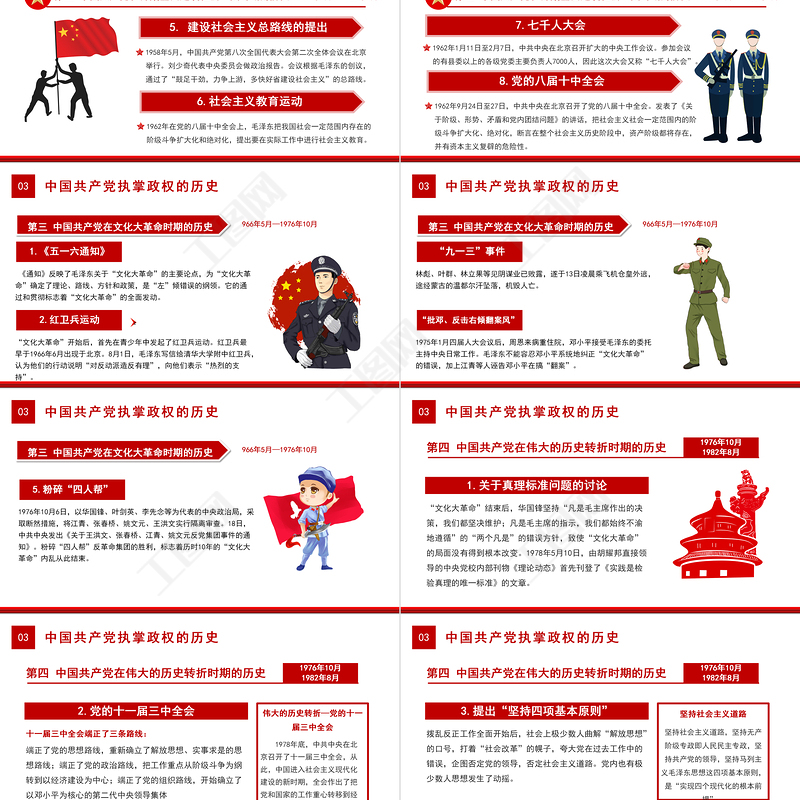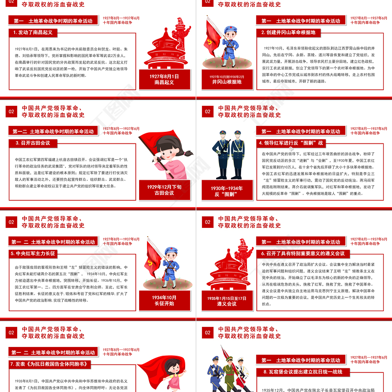 <p>2021黨史專題講座—— 黨政部門/國有企業/黨支部2021年黨史學習教育專題輔導——【慶祝建黨100周年專題黨課】</p><br><p></p><br><p>中國共產黨建立的背景和經過中國共產黨領導革命、奪取政權的浴血奮戰史中國共產黨執掌政權的歷史010203CONTENTS目 錄</p><br><p>中國共產黨建立的背景和經過第一章節</p><br><p>中國舊民主主義革命失敗,中國一步一步淪為半殖民地半封建國家新文化運動的興起,馬克思主義的初步傳播馬克思列寧主義的廣泛傳播,早期共產主義組織的建立工人運動的發展,無產階級的成長壯大五四運動爆發和中國工人階級登上政治舞臺12345第一 中國共產黨建立的背景</p><br><p>第二 中國共產黨的創立</p><br><p>第二 中國共產黨的創立偉大意義</p><br><p>中國共產黨領導革命、奪取政權的浴血奮戰史第二章節</p><br><p>1922年的香港海員大罷工。這次罷工是中國共產黨成立后領導的第一次大規模鐵路工人大罷工,規模大,范圍廣,表現出工人階級的團結性和斗爭精神,并且得到各地工人廣泛的同情和支持,推動了工人運動的開展.因此,它是中國第一次工人運動高潮的起點。從1922年1月開始,到1923年2月,中國共產黨領導的工人運動形成第一次高潮,前后持續時間達13個月之久。在此期間,爆發的罷工斗爭達100多次,參加罷工的工人達30萬以上。1921年8月—1927年7月大革命時期第一 中國共產黨在創立初期的革命活動1.中國的工人運動出現第一次高潮▲京漢鐵路工人大罷工▲香港海員大罷工▲安源路礦工人罷工▲省港工人罷工</p><br><p>1923年6月12日至20日 黨的三大根據馬列主義的策略思想,結合中國的具體情況,正確地確定了革命統一戰線的方針政策,促進了國共合作的迅速形成。1924年1月20日至30日 中國國民黨第一次全國代表大會通過了《中國國民黨第一次代表大會宣言》,接受了中國共產黨提出的反帝反封建主張,重新解釋了三民主義,確定了聯俄、聯共、扶助農工的三大政策。標志著第一次國共合作的正式形成和第一次國內革命戰爭的正式開始。1921年8月—1927年7月大革命時期第一 中國共產黨在創立初期的革命活動2.推動統一戰線的形成</p><br><p>1926年至1927年間,中國人民在中國共產黨和國民黨的共同組織領導下進行了反對帝國主義和北洋軍閥的革命戰爭。結果,蔣介石反動集團竊取了革命果實,建立了新的軍閥統治,轟轟烈烈的北伐戰爭以失敗告終。1921年8月—1927年7月大革命時期第一 中國共產黨在創立初期的革命活動2.積極參加北伐戰爭打到列強除軍閥▲廣東革命政府在廣州誓師北伐</p><br><p>1927年8月1日,在周恩來為書記的中共前敵委員會和賀龍、葉挺、朱德、劉伯承等領導下,黨所掌握和影響的國民革命軍等武裝2萬余人,在南昌舉行的針對國民黨的分共政策而發起的武裝反抗。這次起義打響了武裝反抗國民黨反動派的第一槍,開始了中國共產黨獨立地領導革命武裝斗爭和創建人民革命軍隊的新時期。1927年8月—1937年6月十年國內革命戰爭第一 土地革命戰爭時期的革命活動1.發動了南昌起義1927年8月1日南昌起義</p><br><p> 1927年10月,**率領秋收起義的部隊到達江西羅霄山脈中段的井岡山,先后在寧岡、永新、茶陵、遂川等縣恢復和建立了黨組織,發展武裝力量,開展游擊戰爭,領導農民打土豪分田地,建立紅色政權,實行工農武裝割據,創立了黨領導下的第一個農村革命根據地。為中國革命的中心工作完成從城市到農村的偉大戰略轉移,走上農村包圍城市,最后奪取城市,開辟了新的道路。1927年8月—1937年6月十年國內革命戰爭第一 土地革命戰爭時期的革命活動2.創建井岡山革命根據地1927年10月到1930年2月井岡山根據地</p><br><p>中國工農紅軍第四軍福建上杭縣古田鎮召開。會議強調紅軍是一個"執行革命的政治任務的武裝集團",黨對軍隊的絕對領導決定著軍隊的性質和面貌,這是紅軍建設的根本原則;規定紅軍除了要進行打仗消滅敵人的軍事活動之外,還要擔負起宣傳群眾、組織群眾、武裝群眾、幫助群眾建立革命政權以至于建立共產黨的組織等項重大任務。1927年8月—1937年6月十年國內革命戰爭第一二 土地革命戰爭時期的革命活動3.召開古田會議1929年12月下旬古田會議</p><br><p>在中國共產黨的領導下,紅軍經過三年艱苦曲折的游擊戰爭,粉碎了國民黨反動派的多次“進剿”與“會剿”,至1930年夏,中國工農紅軍已發展到約10萬人,在十余個省先后開辟了大小十多塊革命根據地。中國工農紅軍的迅速發展和革命根據地的日益擴大,特別是李立三“左”傾冒險主義的軍事行動,震動了國民黨的反動統治。蔣馮閻軍閥混戰剛剛結束,蔣介石就調集軍隊,對紅軍和革命根據地,發動了大規模的反革命“圍剿”。中央根據地是敵人“圍剿”的重點。1927年8月—1937年6月十年國內革命戰爭第一 土地革命戰爭時期的革命活動4.領導紅軍進行反“圍剿”戰爭1930年-1934年反“圍剿” </p><br><p>由于敵強我弱的客觀形勢和王明“左”傾冒險主義的錯誤的影響,中央紅軍未能打破蔣介石的第五次“圍剿”, 1934年10月,中央紅軍主力被迫退出中央革命根據地,突圍轉移,開始長征。1936年10月,中國工農紅軍第一、二、四方面軍在甘肅會寧勝利會師。至此,紅軍長征勝利結束。長征的意義在于,鍛煉和考驗了黨和紅軍的精華,擴大了中國共產黨的政治影響,實現了戰略性的轉移。1927年8月—1937年6