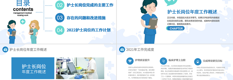 01護士長崗位年度工作概述020304目錄contentsmanagement medical nursing work護士長崗位完成的主要工作存在的問題和改進措施2022護士崗位的工作計劃01護士長崗位年度工作概述020304目錄contentsmanagement medical nursing work護士長崗位完成的主要工作存在的問題和改進措施2022護士崗位的工作計劃01護士長崗位年度工作概述020304目錄contentsmanagement medical nursing work01護士長崗位年度工作概述020304目錄contentsmanagement medical nursing work護士長崗位完成的主要工作存在的問題和改進措施