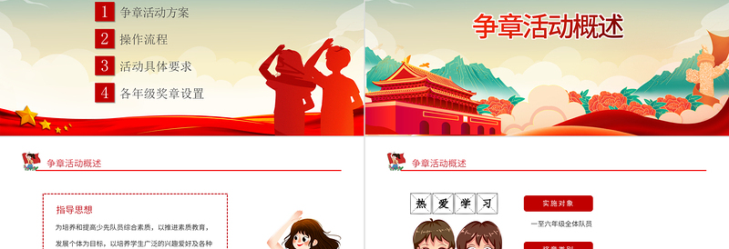 爭(zhēng)章活動(dòng)概述實(shí)施對(duì)象一至六年級(jí)全體隊(duì)員獎(jiǎng)?wù)骂?lèi)別獎(jiǎng)?wù)路譃榘嚓?duì)章和特色章兩類(lèi)。經(jīng)過(guò)努力,達(dá)到一定的標(biāo)準(zhǔn),即可獲章。