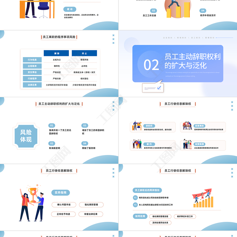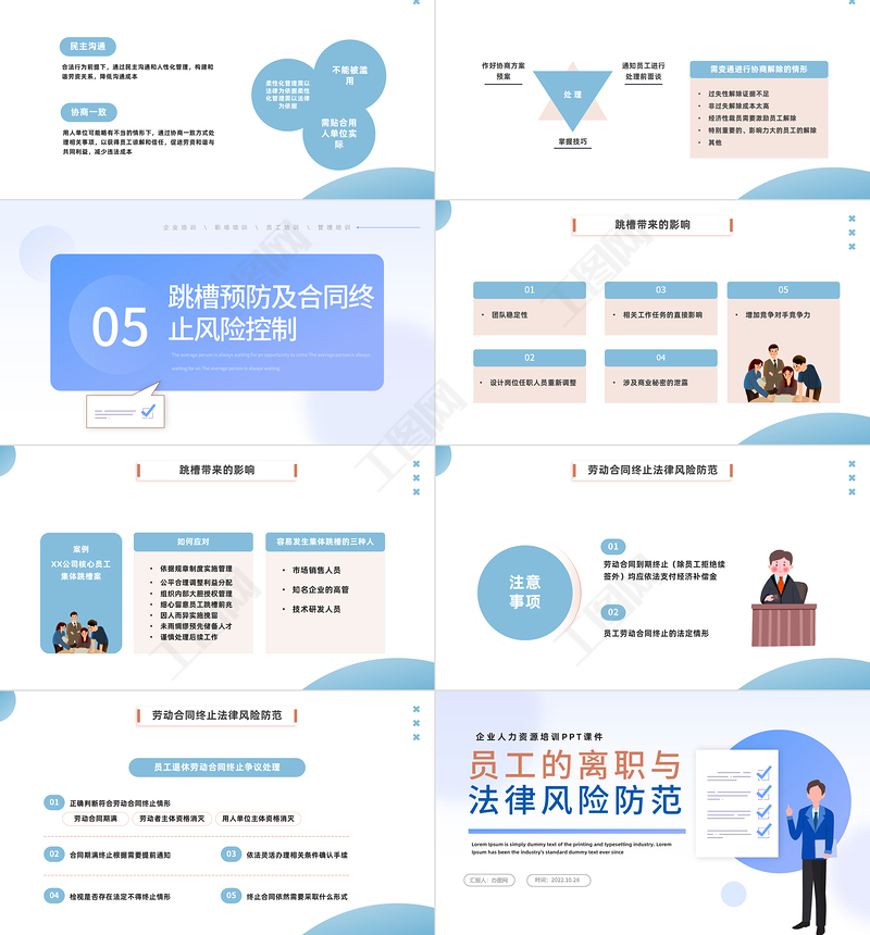 工圖網(wǎng)提供2022員工的離職與法律風(fēng)險(xiǎn)防范PPT插畫風(fēng)企業(yè)人力資源培訓(xùn)新員工專題培訓(xùn)課件模板供會(huì)員免費(fèi)下載。更多精彩黨課PPT素材,盡在工圖網(wǎng)。