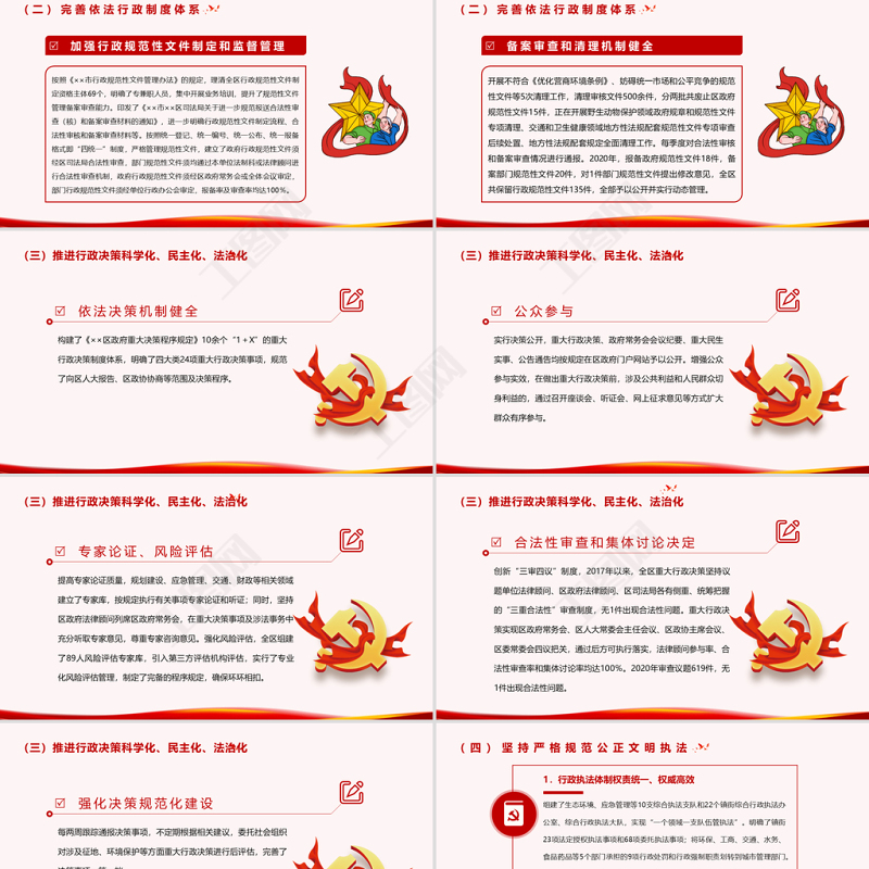 此模板版權為辦圖網網所有!提示:此PPT為盜版辦圖網網模板,如下載使用,會因兼容問題導致軟件崩潰,請勿下載!!!(三)推進行政決策科學化、民主化、法治化構建了《××區政府重大決策程序規定》10余個“1+X”的重大行政決策制度體系,明確了四大類24項重大行政決策事項,規范了向區人大報告、區政協協商等范圍及決策程序。