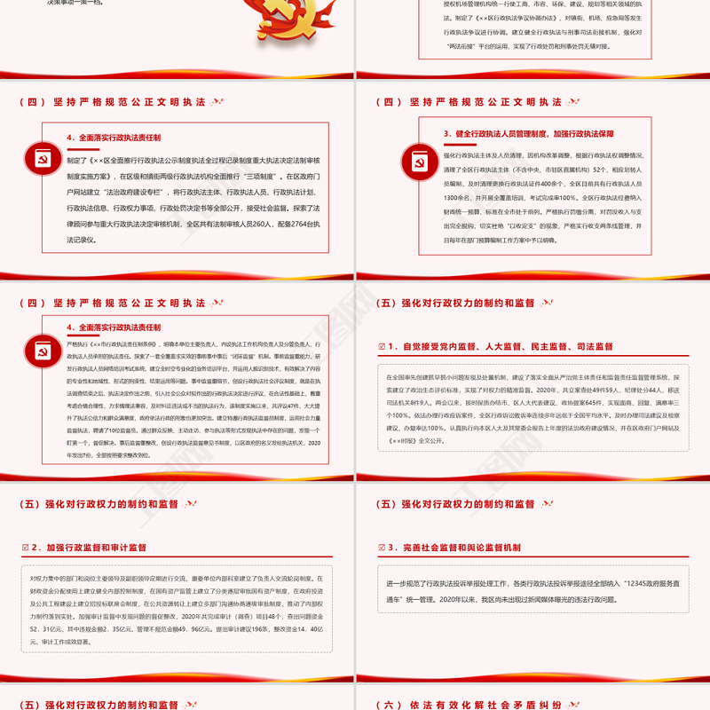 此模板版權為辦圖網網所有!提示:此PPT為盜版辦圖網網模板,如下載使用,會因兼容問題導致軟件崩潰,請勿下載!!!此模板版權為辦圖網網所有!提示:此PPT為盜版辦圖網網模板,如下載使用,會因兼容問題導致軟件崩潰,請勿下載!!!(五)強化對行政權力的制約和監督在全國率先創建抓早抓小問題發現及處置機制,建設了落實全面從嚴治黨主體責任和監督責任監督管理系統,探索建立了政治生態評價標準,實現了對權力的精準監督。2020年,共立案查處49件59人,紀律處分44人,移送司法機關8件9人。兩會以來,按時保質辦結市、區人大代表建議、政協提案645件,實現面商、回復、滿意率三個100%。依法辦理行政應訴案件,全區行政訴訟敗訴率連續多年遠低于全國平均水平。及時辦理司法建議及檢察建議,辦復率達100%。認真執行向本區人大及其常委會報告上年度的法治政府建設情況,并在區政府門戶網站及《××時報》全文公開。1.自覺接受黨內監督、人大監督、民主監督、司法監督