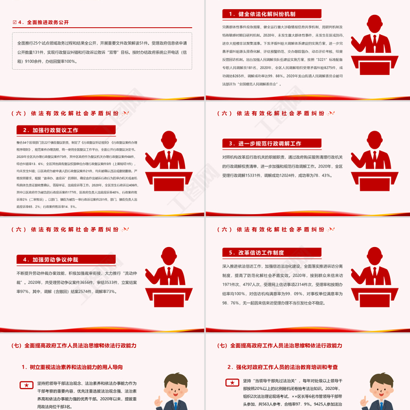 此模板版權為辦圖網網所有!提示:此PPT為盜版辦圖網網模板,如下載使用,會因兼容問題導致軟件崩潰,請勿下載!!!(一)依法全面履行政府職能06 創新社會治理,優化公共服務建立健全政府購買服務管理制度,規范了政府購買服務操作流程,2020年,我區政府購買服務的項目140個,執行金額24598.45萬元,占全區政府采購執行總額170866.66萬元的14.4%。制定了《全面推進公共法律服務體系建設實施方案》“1+3”文件,建立了三級公共法律服務實體平臺,財政每年投入420萬元,安排近300名專業律師到中心、入鎮街、進村居,構建起“中心律師天天見”“鎮街律師周三見”“村居律師月月見”的具有××特色的公共法律服務品牌。到村居開展法治宣傳655場次,提供法律咨詢4465人次,參與調解矛盾糾紛284件,協助處理其他事務36件,開展民法典現場宣傳473場次。組織專業律師隊伍全方位服務民營經濟發展,共計為企業提供合同審查236件,開展法治宣講19場次,提供法律咨詢326人次,參與處理涉企矛盾糾紛化解74件次,編發法律政策解讀和指引64件,開展企業上市講座1場次。法律援助實現應援優援,2020年,共受理法律援助案件886件,辦結各類法律援助案件848件;解答各類來電、來訪咨詢3299人次、代寫法律事務文書120份,提供上門服務10次,為受援人挽回經濟損失518.94萬元,持續實現了法律援助“零”投訴。嚴格按程序處理法律服務行業投訴,2020年,收到法律服務行業的投訴案件共計125件,按法定程序進行處理,全年未發生因未及時處理投訴造成一定后果等情況。