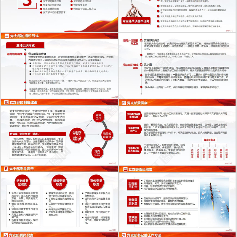 黨支部委員職責五負責召集支部委員會和黨員大會;落實和執行黨的方針、政策;研究制定支部重大問題。做好經常性思想政治工作。監督和檢查支部工作計劃和決議情況。支持工會和共青團組織開展工作。抓好支部民主建設,按時召開支部民主生活會。黨支部書記職責掌握支部組織狀況,提出黨小組劃分和調整意見。了解和掌握黨員的思想狀況。認真做好支部發展黨員工作 。做好支部黨員管理工作。收集黨員模范事跡材料產推薦工作。組織委員職責宣傳委員職責了解和掌握黨員和群眾的思想狀況。組織黨員學習黨的基本理論。組織開展形式多樣的主題教育實踐活動和文體活動。做好黨報、黨刊的發行工作 。充分利用電視、報低等宣傳工作,開展宣傳鼓動工作。