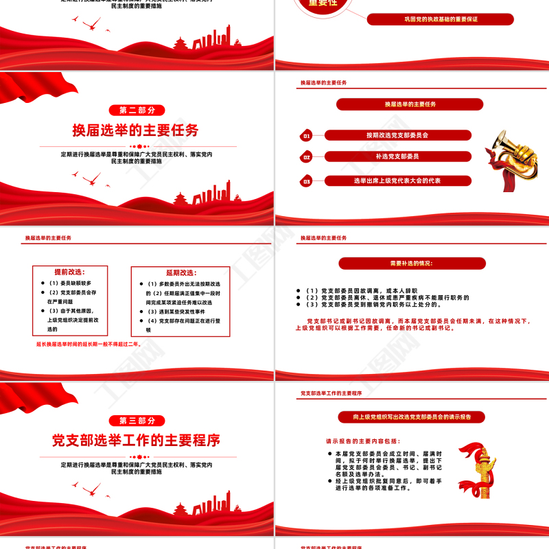 工圖網(wǎng)提供黨支部換屆選舉工作程序PPT黨政風(fēng)黨支部換屆選舉工作程序?qū)n}黨課課件模板供會(huì)員免費(fèi)下載。更多精彩黨課PPT素材,盡在工圖網(wǎng)。