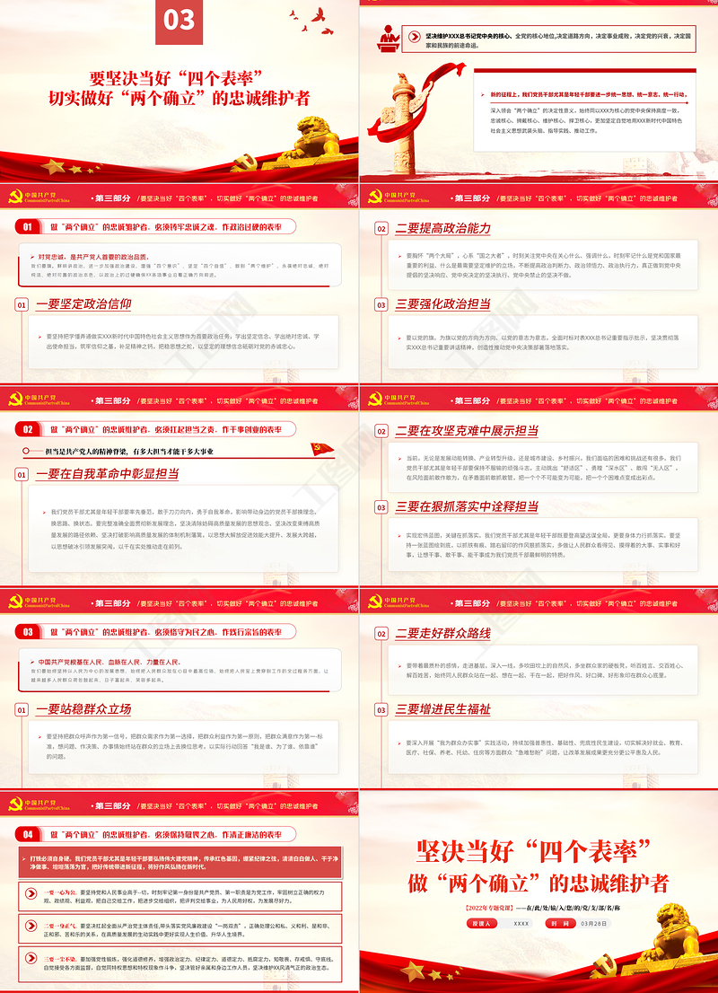 堅決當好“四個表率”做好“兩個確立”的忠誠維護者PPT紅色簡約風黨員干部學習教育專題黨課課件模板