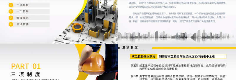<p>2020內容全面實用安全生產培訓,適用行業廣泛。COMPANY/PAPER/ARTICLE/PLANNING SYSTEM生產安全事故應急條例TEAM BUILDINGAND ORIENTATION 深入解讀企業培訓</p><br><p>CONTENTS1三項制度一個機制保障要求法律責任234</p><br><p>《生產安全事故應急條例》(以下簡稱《條例》)是第一部專門針對生產安全事故應急工作的行政法規。《條例》作為實施安全生產法、突發事件應對法的重要支撐,其頒布實施必將全面提高我國生產安全事故應急工作的法治水平和應急能力。針對生產經營單位的事故應急工作,《條例》明確了三項制度、一個機制和四方面應急管理保障要求,即:應急預案制度、定期應急演練制度和應急值班制度,第一時間應急響應機制,人員、物資、科技、信息化等方面應急管理保障要求;同時,規定了應急工作違法行為的法律責任。前 言</p><br><p>PART 01三項制度TEAM BUILDING AND ORIENTATION</p><br><p>應急救援預案制度制修訂應急救援預案是應急工作的重中之重規定生產經營單位應針對可能發生事故的特點和危害、危險源辨識和風險評價的結果編制應急救援預案;要求應急救援預案應當符合有關法律、法規、規章和標準的規定,具有科學性、針對性和可操作性;在發生法律法規、機構職責、資源條件、重大風險或者其他變化時應當及時修訂應急救援預案;規定應急救援預案應到有關部門備案并依法向社會公布。第五條第六條第七條</p><br><p>有下列情形之一的,生產安全事故應急救援預案制定單位應當及時修訂相關預案1制定預案所依據的法律、法規、規章、標準發生重大變化2應急指揮機構及其職責發生調整3安全生產面臨的風險發生重大變化4重要應急資源發生重大變化5在預案演練或者應急救援中發現需要修訂預案的重大問題6其他應當修訂的情形</p><br><p>應急演練制度應急演練是確保及時、科學、高效、有效應急處置的一項重要工作規定生產經營單位在演練中發現應急預案存在重大問題要及時修訂。易燃易爆物品、危險化學品等危險物品的生產、經營、儲存、運輸單位,礦山、金屬冶煉、城市軌道交通運營、建筑施工單位,以及賓館、商場、娛樂場所、旅游景區等人員密集場所經營單位,應當至少每半年組織1次生產安全事故應急救援預案演練,同時規定有關部門抽查演練。第六條第八條</p><br><p>應急演練制度應急演練是確保及時、科學、高效、有效應急處置的一項重要工作危險物品生產、經營儲存、運輸單位礦山、金屬冶煉、城市軌道交通運營人員密集場所經營單位建筑施工單位至少每半年組織一次生產安全事故應急救援預案演練同時規定有關部門抽查演練</p><br><p>應急演練制度應急演練是確保及時、科學、高效、有效應急處置的一項重要工作危險物品易燃易爆物品危險化學品……人員密集場所賓館商場……娛樂場所旅游景區</p><br><p>危險物品生產經營儲存運輸應急值班制度當好黨和人民的守夜人是新時代對應急管理工作者的要求易燃易爆物品、危險化學品等危險物品的生產、經營、儲存、運輸單位,礦山、金屬冶煉、城市軌道交通運營、建筑施工單位,以及賓館、商場、娛樂場所、旅游景區等人員密集場所經營單位,應當至少每半年組織1次生產安全事故應急救援預案演練,同時規定有關部門抽查演練。第十四條</p><br><p>應急值班制度當好黨和人民的守夜人是新時代對應急管理工作者的要求危險物品的生產、經營、儲存、運輸單位礦山、金屬冶煉、城市軌道交通運營建筑施工單位、應急救援隊伍應急值班制度</p><br><p>應急值班制度當好黨和人民的守夜人是新時代對應急管理工作者的要求規模較大、危險性較高的易燃易爆物品、危險化學品等危險物品的生產、經營、儲存、運輸單位應急處置技術組二十四小時應急值班</p><br><p>PART 02一個機制TEAM BUILDING AND ORIENTATION</p><br><p>事故發生應急預案請求支援第一時間應急響應機制事故發生后,第一時間做出積極響應、采取有效措施是防止事故擴大、降低事故損失的關鍵一環事故發生后,生產經營單位應當立即啟動應急預案,迅速控制危險源,搶救遇險人員,組織人員撤離,采取措施防止次生衍生災害發生,維護好現場秩序,保護事故現場和相關證據。同時,如果超出本單位應急能力,應及時向有關單位或者部門請求支援。第十七條</p><br><p>第一時間應急響應機制事故發生后,第一時間做出積極響應、采取有效措施是防止事故擴大、降低事故損失的關鍵一環應急預案迅速控制危險源搶救遇險人員組織人員撤離采取措施防止次生衍生災害發生維護好現場秩序保護事故現場和相關證據</p><br><p>PART 03保障要求TEAM BUILDING AND ORIENTATION</p><br><p>為了保障應急制度和機制的實施,提出了對人員、物資、科技、信息化等方面的應急保障要求。四方面保障要求人員物資科技信息化</p><br><p>生產經營單位應建立健全事故應急責任制、主要負責人對事故應急工作全面負責。第四條高危行業單位應當建立應急救援隊伍,小型企業或者微型企業等規模較小的生產經營單位可以不建立應急救援隊伍,但應當指定兼職的應急救援人員,并且可以與鄰近的應急救援隊伍簽訂應急救援協議。產業聚集區域內的單位可以聯合建立應急救援隊伍。第十條高危行業單位建立應急救援隊伍規模較小的生產經營單位指定兼職的應急救援人員產業聚集區域
