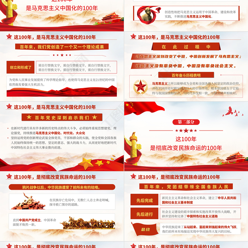 <p>百年大黨風華掠影【慶祝建黨100周年專題黨課】——黨政部門/國有企業/黨支部/團支部2021年黨性教育專題輔導</p><br><p>1921年7月,黨的一大宣告中國共產黨正式成立。彼時,全國黨員僅有50余人。時光輾轉100年,中國共產黨已經成為具有重大全球影響力的世界第一大執政黨,擁有黨員9500多萬人?!爸袊a生了共產黨,這是開天辟地的大事變。”回首過去,百年大黨,與人民群眾風雨同舟;百年黨史,同民族復興相與為一;百年奮斗,與人類進步和衷共濟。 百年來,在中國共產黨的領導下,中國人民深刻改變了近代以后中華民族發展的方向和進程,深刻改變了自身和民族的前途和命運,深刻改變了世界發展的趨勢和格局。前言 Preface</p><br><p>目錄</p><br><p>第一部分這100年是馬克思主義中國化的100年</p><br><p>這100年,是馬克思主義中國化的100年就把馬克思主義作為自己的指導思想,堅持把馬克思主義基本原理與中國的具體實際緊密結合起來創造性地把馬克思主義運用于中國革命、建設和改革實踐,不斷推進馬克思主義中國化。</p><br><p>這100年,是馬克思主義中國化的100年為黨和人民事業發展提供了科學理論指導,也使得馬克思主義在21世紀的中國依然煥發著強大生機活力。</p><br><p>這100年,是馬克思主義中國化的100年馬克思主義深刻改變了中國,中國創新發展了馬克思主義;社會主義沒有辜負中國,中國沒有辜負社會主義。馬克思主義之所以能夠成為全黨和全國各族人民堅定的政治信仰,并在不同歷史時期呈現出巨大的引領作用,根本原因就在于它始終與我國國情相結合,與時代步伐相一致,與群眾呼聲相映襯。</p><br><p>這100年,是馬克思主義中國化的100年在新時代進行具有許多新的歷史特點的偉大斗爭,必須始終重視思想建黨、理論強黨,持續推進馬克思主義中國化、時代化、大眾化堅持運用黨的創新理論武裝全體黨員、干部和群眾的頭腦,使全黨和全國各族人民始終保持統一的思想、堅定的意志、強大的戰斗力,從而更好地把新時代中國特色社會主義偉大事業推向前進。</p><br><p>第二部分這100年是徹底改變民族命運的100年</p><br><p>這100年,是徹底改變民族命運的100年在民族存亡危局中,無數仁人志士奔走吶喊,探尋救亡圖存的道路。直到中國共產黨成立,中國革命面貌才煥然一新。</p><br><p>這100年,是徹底改變民族命運的100年中華民族迎來了從站起來、富起來到強起來的偉大飛躍,我們前所未有地接近實現中華民族偉大復興的目標。</p><br><p>這100年,是徹底改變民族命運的100年百年黨史深刻啟示我們,中國共產黨領導是黨和國家的根本所在、命脈所在,是全國各族人民的利益所系、命運所系。</p><br><p>這100年,是徹底改變民族命運的100年全面建設社會主義現代化國家,奮力實現第二個百年奮斗目標,必須始終堅持黨的全面領導,增強“四個意識”、堅定“四個自信”、做到“兩個維護”,弘揚建黨精神,進行偉大斗爭、建設偉大工程、推進偉大事業,把改革開放進行到底。</p><br><p>第三部分這100年是堅持為人民謀幸福的100年</p><br><p>這100年,是堅持為人民謀幸福的100年“過去的一切運動都是少數人的,或者為少數人謀利益的運動。無產階級的運動是絕大多數人的,為絕大多數人謀利益的獨立的運動。”這一理論品格在馬克思主義中國化的進程中得以賡續傳承。中國共產黨在成立之初就將“為人民謀幸?!弊鳛樽约旱某跣暮褪姑?lt;/p><br><p>這100年,是堅持為人民謀幸福的100年“為人民謀幸?!笔冀K是貫穿中國共產黨奮斗歷程的鮮明主線。需自行替換文字,需自行替換文字。需自行替換文字,需自行替換文字。需自行替換文字,需自行替換文字。需自行替換文字,需自行替換文字。需自行替換文字,需自行替換文字。需自行替換文字,需自行替換文字。需自行替換文字,需自行替換文字。</p><br><p>這100年,是堅持為人民謀幸福的100年</p><br><p>這100年,是堅持為人民謀幸福的100年江山就是人民,人民就是江山,打江山、守江山,守的是人民的心,靠的是以百姓心為心。新時代中國共產黨人要牢固樹立馬克思主義群眾觀,堅定不移貫徹落實黨的群眾路線,堅持人民至上、緊緊依靠人民、不斷造福人民、牢牢植根人民,同人民群眾同呼吸、共命運、心連心,積極投身于造福人民的偉大實踐。</p><br><p>第四部分這100年是推動人類歷史進步的100年</p><br><p>這100年,是推動人類歷史進步的100年中國共產黨就在為實現中華民族偉大復興頑強拼搏的同時,也在為人類解放事業奮發有為。百年來,中國共產黨始終關注人類的前途與命運,堅持同世界上一切進步力量攜手前進。</p><br><p>這100年,是推動人類歷史進步的100年中國共產黨人奮戰于抗日最前線,是全民族抗戰的中流砥柱,支撐著中華民族救亡圖存的希望,為世界反法西斯戰爭的全面勝利作出了巨大貢獻。中國共產黨倡導并堅持“和平共處”五項原則,高舉反對霸權主義、維護世界和平的旗幟,大大加強了世界和平民主的力量。需自行替換文字,需自行替換文字。需自行替換文字,需自行替換文字。需自行替換文字,需自行替換文字。需自行替換文字,需自行替換文字。需自行替換文字,需自行替換文字。需自行需自行替換文字,需自行替換文字。</p><br><p>這100年,是推動人類歷史進步的100年和平、和睦、和諧既是中華民族5000多年來一直追求和傳承的理念,也是中國共產黨