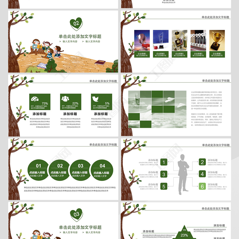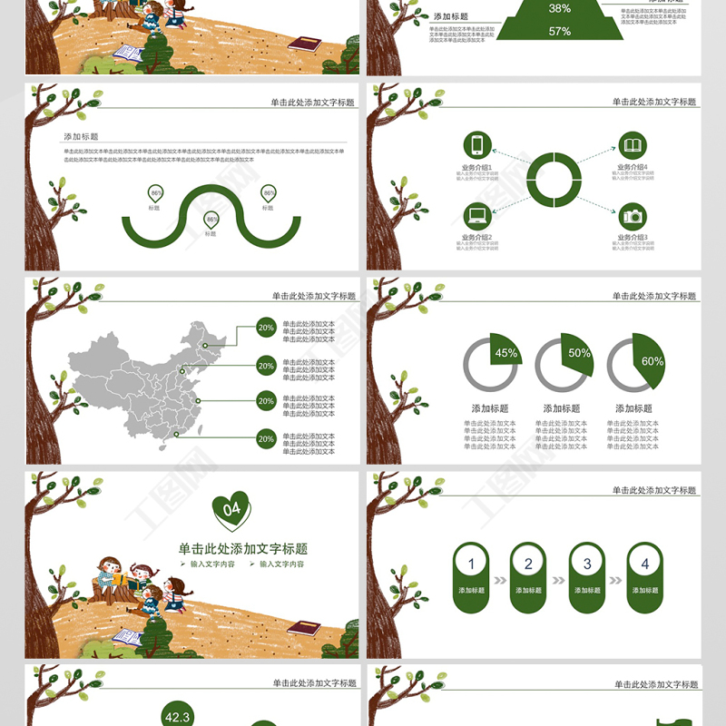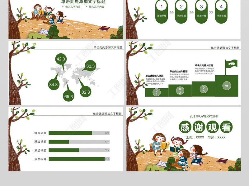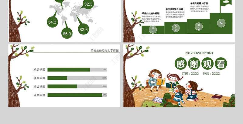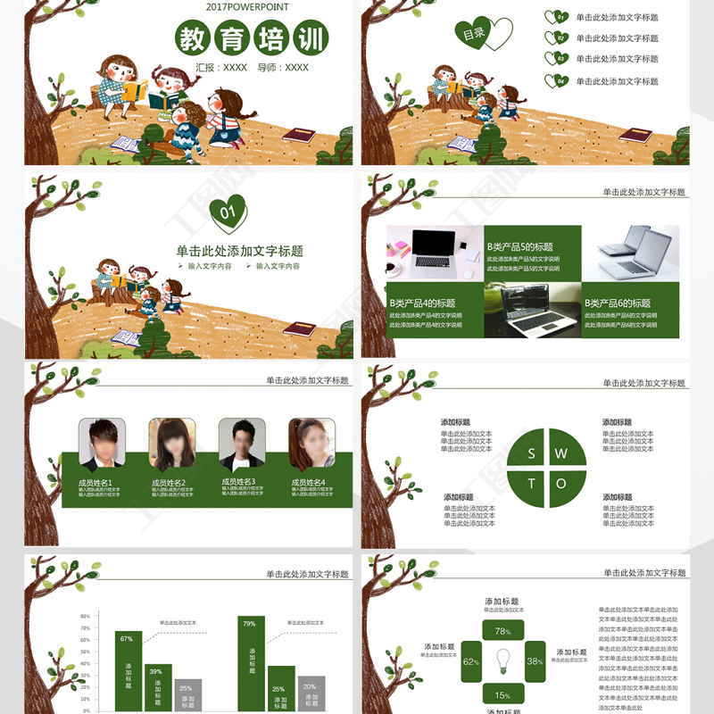 小清新綠葉語文課件我們仨讀書報告讀書分享PPT模版包含