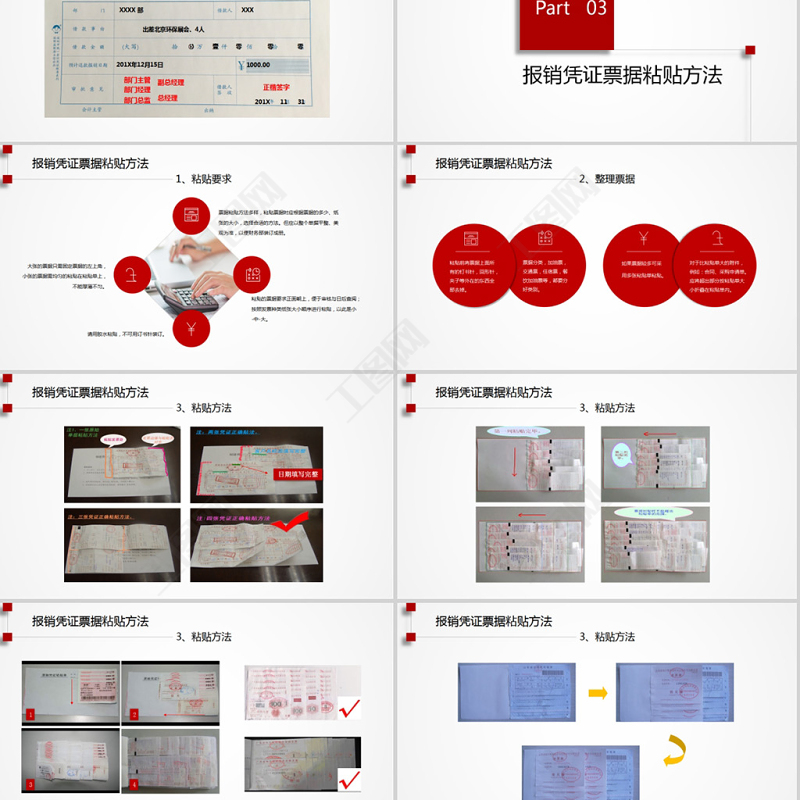 報銷憑證票據粘貼方法2、整理票據粘貼前將票據上面所有的釘書針,回形針,夾子等外在的東西全部去掉。票據分類,加油票,交通票,住宿票,餐飲加油票等,都要分好類別。如果票據較多可采用多張粘貼單粘貼。對于比粘貼單大的附件,例如:合同、采購申請單。應將超出部分按粘貼單大小折疊在粘貼單內。