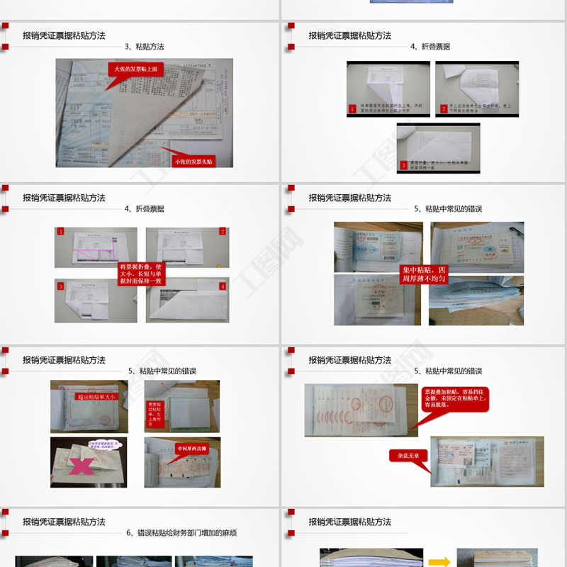 報銷憑證票據粘貼方法6、錯誤粘貼給財務部門增加的麻煩1、斜面增加打孔人員難度與危險度。 2、既不美觀又增加裝訂人員工作量。
