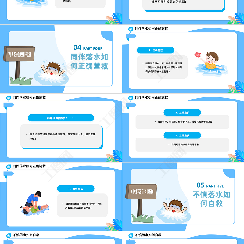 尋找竹竿、樹枝等,俯身趴下來,慢慢將溺水者拉上岸2、正確施救在周邊尋找漂浮物給落水者3、正確施救