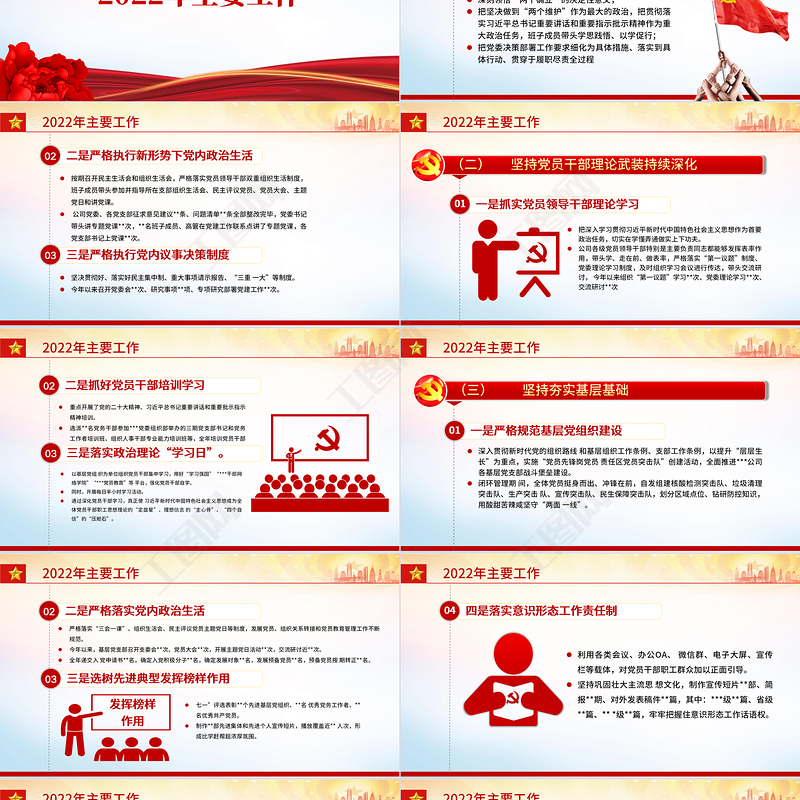 2022年主要工作二是嚴格落實黨內政治生活02嚴格落實“三會一課”、組織生活會、民主評議黨員主題黨日等制度,發展黨員、組織關系轉接和黨員教育管理工作不斷規范。 今年以來,基層黨支部召開支委會**次、黨員大會**次,開展主題黨日活動**次,交流研討近**次。 全年遞交入 黨申請書**名,確定入黨積極分子**名,確定發展對象**名,發展預備黨員**名,預備黨員按 期轉正**名。三是選樹先進典型發揮榜樣作用03七一”評選表彰**個先進基層黨組織、**名 優秀黨務工作者、**名優秀共產黨員。 制作**部先進集體和先進個人宣傳短片,播放覆蓋近** 人次,形成比學趕幫超濃厚氛圍。發揮榜樣 作用