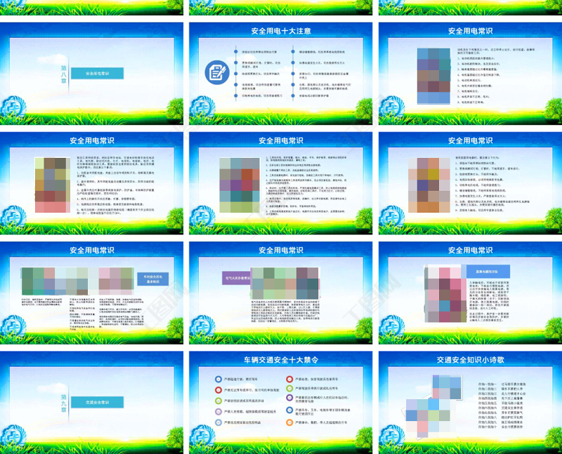 安全用電十大注意保險絲切忌用銅絲或鐵絲代替更換或擦拭燈泡、燈管時,切忌用濕手、濕布檢修或更換燈頭,切忌用手觸及電線破損,切忌用傷濕膏代替絕緣膠布包裹切削帶電的電線,切忌用普通剪刀鋪設墻壁暗線,切忌用單根電線或軟線如遇電器發生火災,切忌直接用水滅火安裝臺燈,切忌將鎮流器直接固定在金屬外殼上臺扇、落地扇以及洗衣機、電冰箱等電氣切忌用兩孔電源插頭,并要安裝可靠的地線安裝電流過載切斷保護器