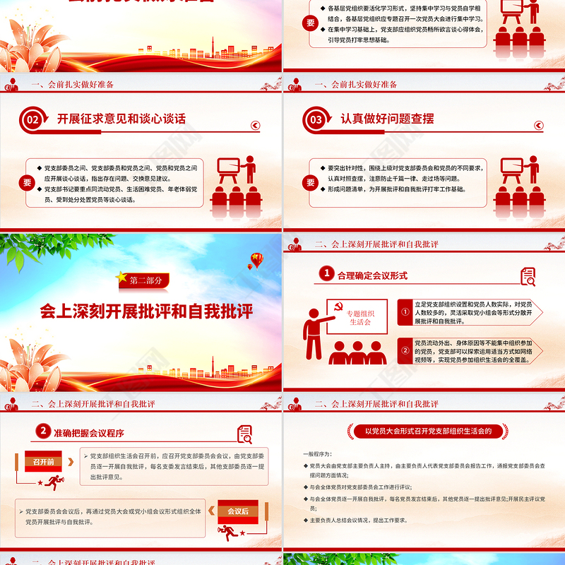 準(zhǔn)確把握會(huì)議程序2召開(kāi)前會(huì)議后黨支部組織生活會(huì)召開(kāi)前,應(yīng)召開(kāi)黨支部委員會(huì)會(huì)議,由黨支部委員逐一開(kāi)展自我批評(píng),每名支委發(fā)言結(jié)束后,其他支部委員逐一提出批評(píng)意見(jiàn)。黨支部委員會(huì)會(huì)議后,再通過(guò)黨員大會(huì)或黨小組會(huì)議形式組織全體黨員開(kāi)展批評(píng)與自我批評(píng)。