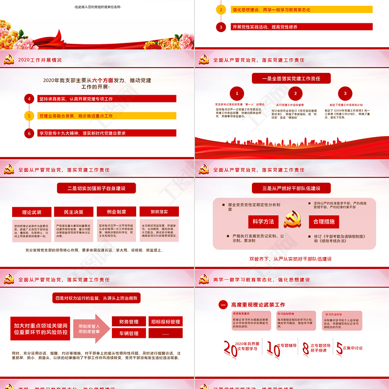 2020工作開展情況2020年我支部主要從六個(gè)方面發(fā)力,推動(dòng)黨建工作的開展:堅(jiān)持求真務(wù)實(shí),認(rèn)真開展黨建專項(xiàng)工作黨建業(yè)務(wù)融合發(fā)展,穩(wěn)步推進(jìn)重點(diǎn)工作學(xué)習(xí)宣傳十九大精神,落實(shí)新時(shí)代黨建總要求456