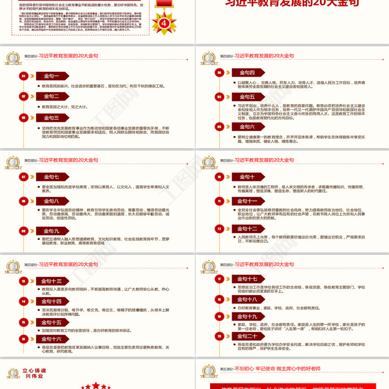 第四部分-教育發展的20大金句金句十教師是人類靈魂的工程師,是人類文明的傳承者,承載著傳播知識、傳播思想、傳播真理,塑造靈魂、塑造生命、塑造新人的時代重任。1011金句十一全黨全社會要弘揚尊師重教的社會風尚,努力提高教師政治地位、社會地位、職業地位,讓廣大教師享有應有的社會聲望,在教書育人崗位上為黨和人民事業作出新的更大的貢獻。12金句十二人民教師無上光榮,每個教師都要珍惜這份光榮,愛惜這份職業,嚴格要求自己,不斷完善自己。