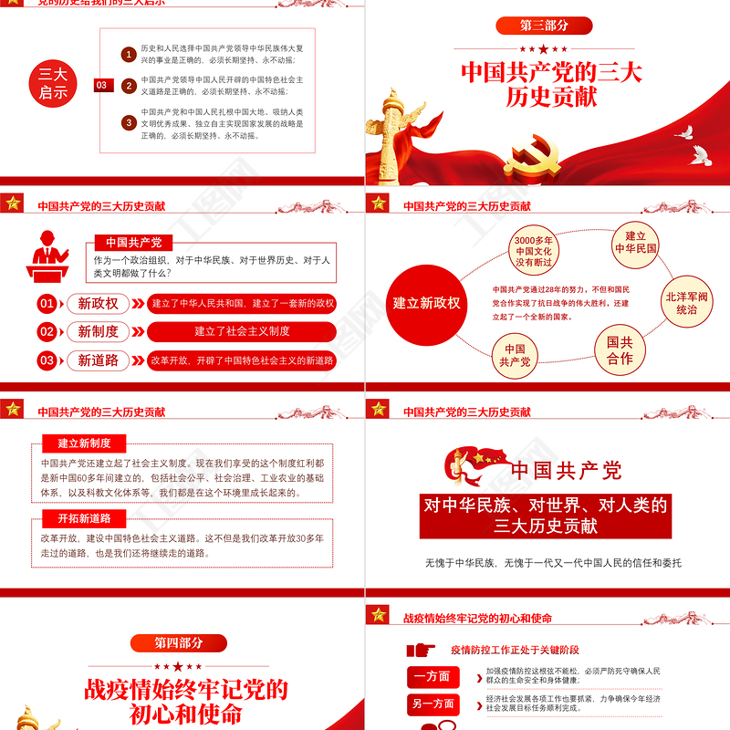 作為一個政治組織,對于中華民族、對于世界歷史、對于人類文明都做了什么?中國共產黨新政權建立了中華人民共和國,建立了一套新的政權新制度建立了社會主義制度新道路改革開放,開辟了中國特色社會主義的新道路中國共產黨的三大歷史貢獻