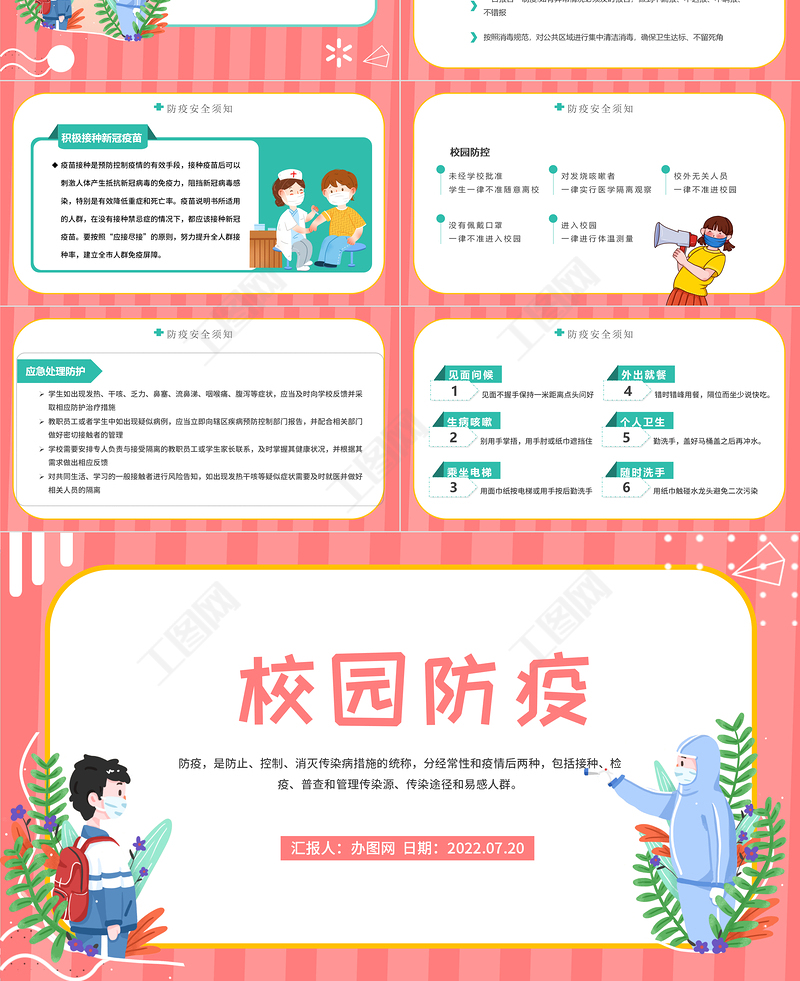 匯報人:辦圖網 日期:2022.07.20校園防疫防疫,是防止、控制、消滅傳染病措施的統稱,分經常性和疫情后兩種,包括接種、檢疫、普查和管理傳染源、傳染途徑和易感人群。