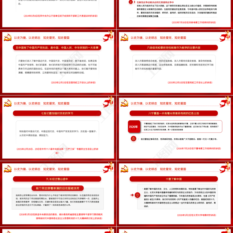 六各級黨校要把黨性教育作為教學的主要內容深入開展理想信念教育、黨的宗旨教育,深入開展黨史國史教育、革命傳統教育,深入開展道德品行教育、法治思維教育、反腐倡廉教育,把黨章和黨規黨紀學習教育作為黨性教育的重要內容。(2015年12月11日在全國黨校工作會議上的講話) 以史為鏡、以史明志 知史愛黨、知史愛國