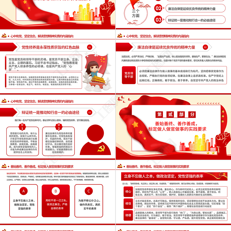 心中有黨、堅定信念,解讀思想精神實質的內涵指向辯證統一是推動知行合一的必由途徑我們每一名共產黨員在新時代,都必須牢記初心使命、錘煉黨性修養、堅守廉潔底線。思想是行動的先導,有什么樣的黨性,就有什么樣作風,只有堅守黨性原則進行長期的黨性修養和鍛煉,不斷自我教育、自我完善、自我提高,成為具有堅強黨性的人,才能為養成廉潔自律的作風提供信念上的支持。廉潔自律作為黨性修養的重要外在表現,對黨性具有保護、鞏固的作用,黨員干部都應加強紀律修養、自覺遵紀守法,充分展示黨的良好形象,增強黨組織的感召力和凝聚力,才能贏得群眾的信任和擁護。0102