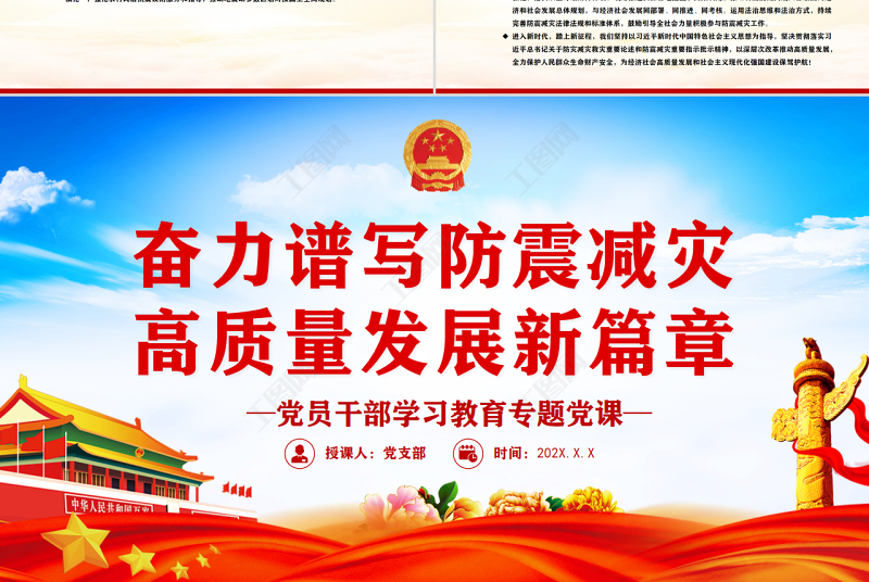 工圖網提供奮力譜寫防震減災高質量發(fā)展新篇章PPT黨政風黨員干部學習教育專題黨課課件模板供會員免費下載。更多精彩黨課PPT素材,盡在工圖網。