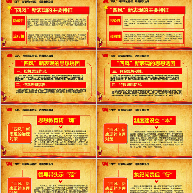 “四風” 新表現(xiàn)的特征、誘因及其治理“四風”新表現(xiàn)的主要特征隱蔽性也就是改頭換面,由地上轉入地下,打起了法紀紅線的“擦邊球”。如違規(guī)公款吃喝轉入內(nèi)部食堂、培訓中心、農(nóng)家樂等隱蔽場所,或接受私營企業(yè)在高檔小區(qū)內(nèi)安排的“一桌餐”;在費用報銷上做手腳,將大額消費拆分成多個小額發(fā)票報銷;收送禮品、禮金避開敏感時間節(jié)點,還通過電子禮品卡、電子紅包、快遞等隱蔽方式進行。流行性也就是說“四風”問題的新表現(xiàn)不是個別現(xiàn)象,其流行范圍還比較廣,帶有明顯的普遍性。如一些領導干部調研走過場、搞形式主義,調研現(xiàn)場成了“秀場”;一些單位“門好進、臉好看”,就是“事難辦”;有的地方層層重復開會,用會議落實會議;部分地區(qū)寫材料、制文件機械照抄,出臺制度決策“依葫蘆畫瓢”。