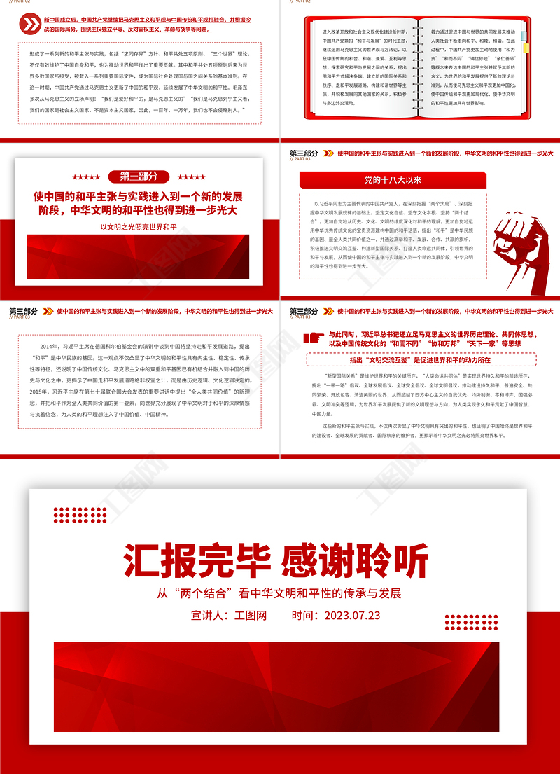 黨員教育培訓專題黨課——喜迎二十大 永遠跟黨走 奮進新征程——匯報完畢 感謝聆聽 從“兩個結合”看中華文明和平性的傳承與發展宣講人:工圖網 時間:2023.07.23