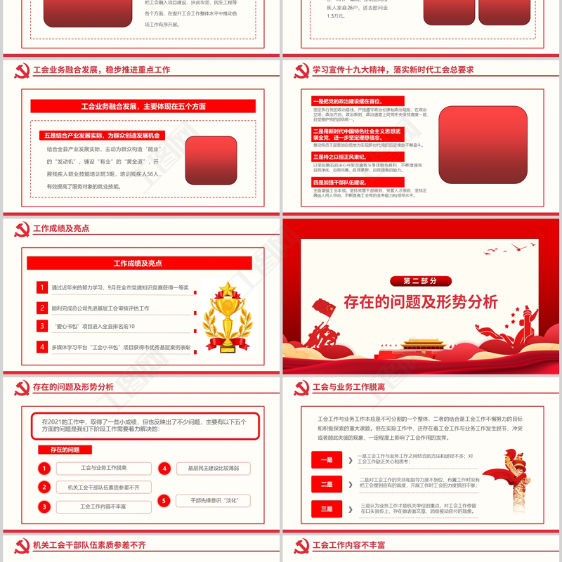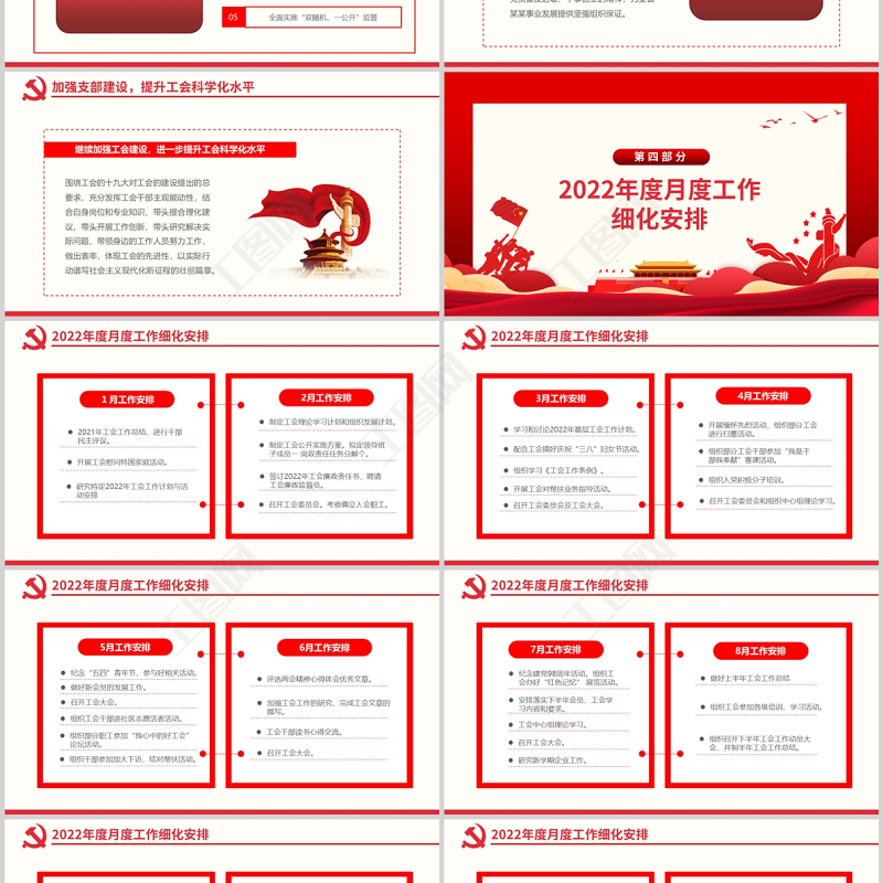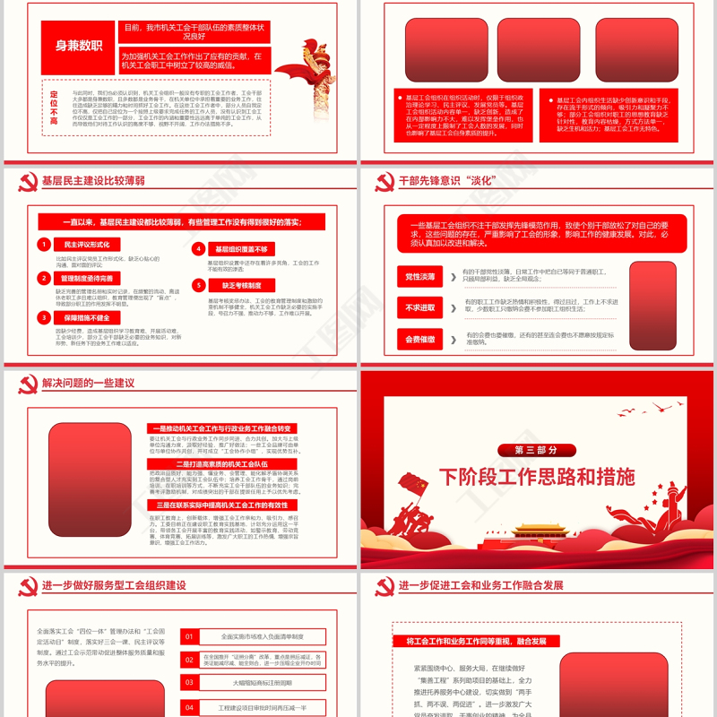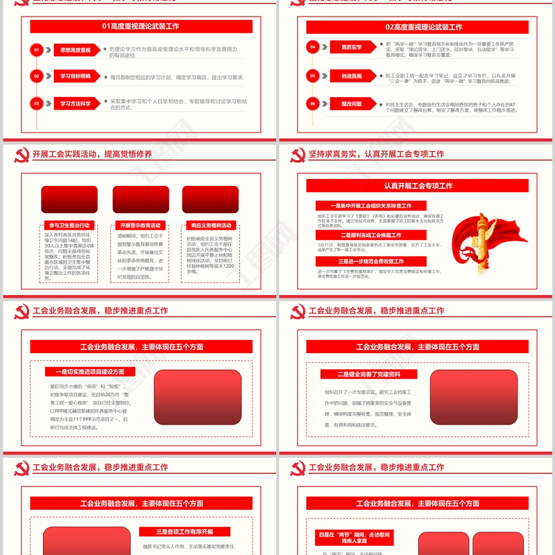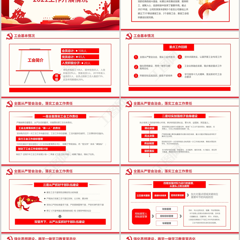 工圖網提供高揚工會旗幟壯大職工聲音PPT紅色大氣基層工會年終工作總結專題黨課課件模板供會員免費下載。更多精彩黨課PPT素材,盡在工圖網。