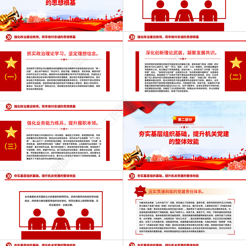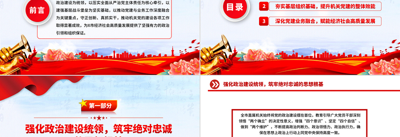 匯報人:某某某 時間:2025.12.12 前言 2025年以來,X市直屬機(jī)關(guān)各級黨組織深入貫徹落實(shí)xx總書 記系列重要講話和重要指示精神,以高質(zhì)量發(fā)展為主題,以黨的 政治建設(shè)為統(tǒng)領(lǐng),以壓實(shí)全面從嚴(yán)治黨主體責(zé)任為核心牽引,以 建強(qiáng)基層戰(zhàn)斗堡壘為堅實(shí)基礎(chǔ),以推動黨建與業(yè)務(wù)工作深度融合 為關(guān)鍵重點(diǎn),守正創(chuàng)新、真抓實(shí)干,推動機(jī)關(guān)黨的建設(shè)各項(xiàng)工作 取得顯著成效,為X市經(jīng)濟(jì)社會高質(zhì)量發(fā)展提供了堅強(qiáng)有力的政治 引領(lǐng)和組織保證。 1 目錄 2 3 第一部分 強(qiáng)化政治建設(shè)統(tǒng)領(lǐng),筑牢絕對忠誠的思想根基 全市直屬機(jī)關(guān)始終將黨的政治建設(shè)擺在首位,教育引導(dǎo)廣大黨員干部深刻 領(lǐng)悟“兩個確立”的決定性意義,增強(qiáng)“四個意識”、堅定“四個自信”、 做到“兩個維護(hù)”,不斷提高政治判斷力、政治領(lǐng)悟力、政治執(zhí)行力,確 保在思想上政治上行動上同黨中央保持高度一致。 強(qiáng)化政治建設(shè)統(tǒng)領(lǐng),筑牢絕對忠誠的思想根基 (一) 堅持把學(xué)習(xí)貫徹總書記重要講話和重要指示批示精神作為各級黨組織會議的“第一 議題”,建立并嚴(yán)格執(zhí)行“傳達(dá)學(xué)習(xí)、制定方案、明確任務(wù)、落實(shí)舉措、跟蹤問效” 的閉環(huán)式五步工作機(jī)制,確保黨中央決策部署在X市不折不扣落地生根。市直機(jī)關(guān)工 委著力強(qiáng)化政治機(jī)關(guān)意識教育和對黨忠誠教育,通過舉辦專題宣講輔導(dǎo)活動、提升 政治能力專題培訓(xùn)班、組織參觀紅色教育基地等多種形式,引導(dǎo)黨員干部從思想深 處鑄牢忠誠品格。各級黨組織通過組織黨員干部重溫入黨誓詞、重讀入黨志愿書、 集體過“政治生日”等政治儀式,持續(xù)強(qiáng)化黨員的身份認(rèn)同感和組織歸屬感,使其 政治信念更加堅定。 強(qiáng)化政治建設(shè)統(tǒng)領(lǐng),筑牢絕對忠誠的思想根基 (二) 堅持將黨的創(chuàng)新理論武裝作為固本培元的基礎(chǔ)工程,督促各部門黨組(黨委)抓實(shí) 理論學(xué)習(xí)中心組學(xué)習(xí),推廣“學(xué)習(xí)、調(diào)研、工作”三位一體模式,并開展全覆蓋的 列席旁聽工作,有力推動了學(xué)思用貫通、知信行統(tǒng)一。全市機(jī)關(guān)廣泛開展“書記講 黨課”活動、“奮發(fā)有為當(dāng)先鋒”主題黨日以及“在改革發(fā)展中建新功”主題演講 比賽等活動,有效激發(fā)了廣大黨員干部干事創(chuàng)業(yè)的責(zé)任感與使命感。年內(nèi),扎實(shí)開 展了深入貫徹中央⑧項(xiàng)規(guī)定精神的專題學(xué)習(xí)教育,構(gòu)建了“關(guān)鍵少數(shù)”帶頭領(lǐng)學(xué)、 重要群體重點(diǎn)促學(xué)、絕大多數(shù)黨員干部全面跟學(xué)的全鏈條學(xué)習(xí)體系。據(jù)統(tǒng)計,全市 機(jī)關(guān)組織領(lǐng)導(dǎo)干部講授專題黨課462場次,對新提拔干部、年輕干部、關(guān)鍵崗位干部 等重點(diǎn)群體開展專題培訓(xùn)超過4200人次。在學(xué)習(xí)教育中,各單位領(lǐng)導(dǎo)班子對標(biāo)對表, 深挖細(xì)查突出問題,共確定了593項(xiàng)具體問題,梳理出863條具體表現(xiàn),并以動真碰 硬的態(tài)度推動問題整改落實(shí),取得了階段性成效。 強(qiáng)化政治建設(shè)統(tǒng)領(lǐng),筑牢絕對忠誠的思想根基 (三) 始終把干部能力作風(fēng)建設(shè)作為一項(xiàng)長期性、基礎(chǔ)性工作來抓,緊密圍繞市委、市政 府部署的優(yōu)化營商環(huán)境、降低全社會物流成本、現(xiàn)代農(nóng)業(yè)產(chǎn)業(yè)發(fā)展等“三個一號工 程”,精心設(shè)計了一系列特色培訓(xùn)課程。其中包括依托本地高校資源的“X共建”名 師特色課、發(fā)揮傳幫帶作用的“X賡續(xù)”領(lǐng)導(dǎo)骨干幫帶課,以及聚焦專業(yè)領(lǐng)域的“淬 煉賦能”重點(diǎn)領(lǐng)域?qū)I(yè)課,累計舉辦跨部門、跨系統(tǒng)的聯(lián)學(xué)講堂48期,有效拓寬了 干部視野。同時,根據(jù)不同行業(yè)、部門及崗位的實(shí)際需求,聚焦社會治理、應(yīng)急處 置、項(xiàng)目建設(shè)等重點(diǎn)工作,組織開展各類實(shí)戰(zhàn)化比武練兵活動60余次,組織基本業(yè) 務(wù)知識和政策法規(guī)測試700余次,累計為1.6萬余名干部進(jìn)行了系統(tǒng)性培訓(xùn)賦能,顯 著提升了干部隊伍的專業(yè)素養(yǎng)和實(shí)戰(zhàn)能力。 第二部分 夯實(shí)基層組織基礎(chǔ),提升機(jī)關(guān)黨建的整體效能 全市直屬機(jī)關(guān)牢固樹立大抓基層的鮮明導(dǎo)向,堅持問題導(dǎo)向和目標(biāo)導(dǎo)向相 結(jié)合,持續(xù)用力推動基層黨組織在標(biāo)準(zhǔn)化、規(guī)范化建設(shè)上取得新突破,實(shí) 現(xiàn)全面進(jìn)步、全面過硬。 夯實(shí)基層組織基礎(chǔ),提升機(jī)關(guān)黨建的整體效能 一 為解決機(jī)關(guān)黨建“上熱中溫下冷”問題,研究建立了知責(zé)明責(zé)、履責(zé)盡責(zé)、督責(zé)考責(zé)的閉環(huán)式工作機(jī)制, 有力推動了各部門黨組(黨委)切實(shí)當(dāng)好主角、抓好主業(yè)、履行好主責(zé)。工委制定印發(fā)了《市直機(jī)關(guān)部 門黨組(黨委)落