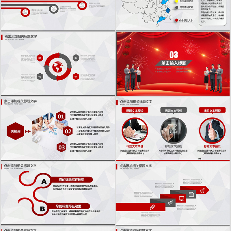 點擊添加相關標題文字ADD RELATED TITLE WORDS標題文本預設此部分內容作為文字排版占位顯示 (建議使用主題字體)如需更改請在(設置形狀格式)菜單下(文本選項)中調整