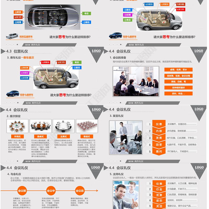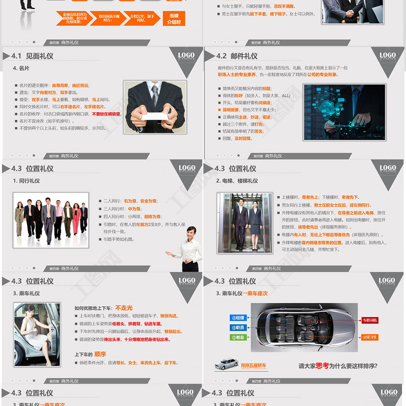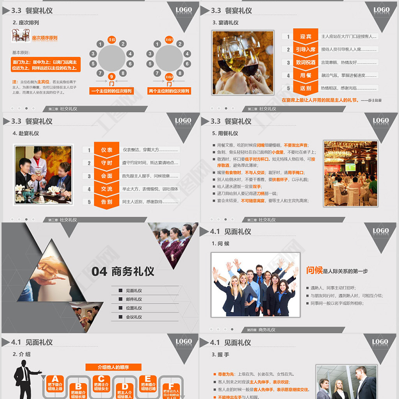 <p>商務(wù)禮儀主講人:辦圖網(wǎng) 時(shí)間:XX年XX月延遲符</p><br><p>目 錄 01. 禮儀概述02. 職業(yè)形象03. 社交禮儀04. 商務(wù)禮儀CONTENTS 延遲符</p><br><p>禮儀概述01延遲符</p><br><p>中國(guó)自古就是禮儀之邦微管仲,吾其被發(fā)左衽矣崖山之后無(wú)中國(guó),明亡之后無(wú)華夏民族自信心消失,全盤否定信仰缺失,拜金主義1.1 禮儀現(xiàn)狀延遲符</p><br><p>尊重他人的一種觀念表達(dá)這種觀念的形式本質(zhì)就是:尊重,就是與人為善,待人以誠(chéng)禮出于俗,俗化為禮禮儀源于我們?cè)谌穗H交往中最易讓人接受的做法1.2 何為禮儀延遲符</p><br><p>1. 禮儀是一個(gè)人的安身立命之本1.3 為何要學(xué)禮儀延遲符</p><br><p>2. 懂禮儀,充滿自信,代表企業(yè)形象客戶之間的交往,商業(yè)活動(dòng)的成功,一般人都猜測(cè)它來(lái)自于不群的智慧、非凡的手段或出眾的口才,然而松下幸之助說(shuō):1.3 為何要學(xué)禮儀塑造組織形象傳播溝通信息提高辦事效率延遲符</p><br><p>3. 不懂禮,別人生氣,后果嚴(yán)重約翰?洛克(英國(guó)哲學(xué)家):不遵守商務(wù)禮儀,往往會(huì)讓人見(jiàn)笑,甚至?xí)斐煞浅?yán)重的后果。齊頃公不尊重各有殘疾的晉、魯、衛(wèi)、曹四國(guó)使臣。四國(guó)歃血為盟,聯(lián)合討伐齊國(guó)。1.3 為何要學(xué)禮儀延遲符</p><br><p>職業(yè)形象02延遲符</p><br><p>2.1 儀容(發(fā)膚容貌)1. 第一印象人與人第一次交往中給人留下的印象,在對(duì)方的頭腦中形成并占據(jù)著主導(dǎo)地位,這種效應(yīng)即為第一印象效應(yīng)。形象、舉止語(yǔ)氣、發(fā)音言語(yǔ)內(nèi)容第一印象取決于初次見(jiàn)面時(shí)的前7秒—2分鐘,非常寶貴,所以說(shuō)“一個(gè)人永遠(yuǎn)沒(méi)有第二次機(jī)會(huì)給別人第一印象”,第一印象可以先聲奪人,造就心理優(yōu)勢(shì),形成“首因效應(yīng)”,學(xué)習(xí)禮儀有助于讓我們給他人留下一個(gè)好的第一印象。延遲符</p><br><p>1)發(fā)型發(fā)式:“女人看頭”時(shí)尚得體,美觀大方、符合身份;不佩戴華麗的頭飾,避免出現(xiàn):遠(yuǎn)看像圣誕樹,近看像雜貨鋪的場(chǎng)面。2)面部修飾:清新淡妝,妝成有卻無(wú)。1)發(fā)型發(fā)式要求:前發(fā)不遮眉,側(cè)發(fā)不掩耳,后發(fā)不及領(lǐng)。2)面部修飾:剔須修面(每日必須),保持清潔。2.1 儀容(發(fā)膚容貌)2. 發(fā)膚容貌延遲符</p><br><p>1. 著裝原則(TPO原則)揚(yáng)長(zhǎng)避短:要會(huì)遮丑,如長(zhǎng)臉不穿V領(lǐng)等;遵守常規(guī):不穿奇裝異服。2.2 儀表(衣著打扮)延遲符</p><br><p>2. 職業(yè)女性著裝2.2 儀表(衣著打扮)延遲符</p><br><p>且“影響工作,炫富、炫耀性別優(yōu)勢(shì)”的首飾不能戴。每種不多于兩件(如耳環(huán)、手鐲)。總數(shù)不超過(guò)三件。多首飾應(yīng)同質(zhì)同色,或不同質(zhì)至少也要同色。如十字架形的掛件在國(guó)際交往中不宜配戴。符合身份以少為佳同質(zhì)同色符合習(xí)俗2.2 儀表(衣著打扮)2. 職業(yè)女性著裝延遲符</p><br><p>在西服套裝、襯衣、領(lǐng)帶中,最少要有兩個(gè)單色,最多一個(gè)圖案。深色西服配淺色襯衫和鮮艷、中深色領(lǐng)帶;中深色西服配淺色襯衫和深色領(lǐng)帶;淺色西服配中深色襯衫和深色領(lǐng)帶。2.2 儀表(衣著打扮)3. 職業(yè)男性著裝延遲符</p><br><p>即全身穿著限制在三種顏色之內(nèi)。鞋子、皮帶、公文包 一個(gè)顏色。忌衣袖商標(biāo)未摘掉、忌西裝與皮鞋不相配、忌不打領(lǐng)帶。2.2 儀表(衣著打扮)3. 職業(yè)男性著裝延遲符</p><br><p>三粒扣:扣上面兩粒或只扣中間一粒或都不扣一粒扣:可扣可不扣四粒扣:扣中間兩粒或都不扣2.2 儀表(衣著打扮)紐扣扣法3. 職業(yè)男性著裝延遲符</p><br><p>合體,系上最上一粒紐扣,能伸進(jìn)去一個(gè)到兩個(gè)手指;襯衫領(lǐng)子應(yīng)露在西服領(lǐng)子外1.5CM左右;抬起手臂時(shí),襯衫袖口也應(yīng)露出西服袖口外1.5CM左右。以保護(hù)西服的清潔;襯衣的下擺一定要塞到褲腰里。2.2 儀表(衣著打扮)3. 職業(yè)男性著裝延遲符</p><br><p>當(dāng)站立時(shí),領(lǐng)帶的長(zhǎng)度要及皮帶或皮帶扣下端1~1.5cm;領(lǐng)帶結(jié)的大小應(yīng)與襯衫領(lǐng)口敞開的角度相配合;當(dāng)打上領(lǐng)帶時(shí),襯衫的領(lǐng)口和袖口都應(yīng)該系上;如果取下領(lǐng)帶,領(lǐng)口的紐扣一定要解開。2.2 儀表(衣著打扮)3. 職業(yè)男性著裝延遲符</p><br><p>正式西服不應(yīng)配休閑鞋;黑色的皮鞋搭配任何西裝都沒(méi)錯(cuò);淺色的皮鞋只能搭配淺色的休閑西服;正式西服時(shí)應(yīng)穿深色(如黑色)的襪子;穿白西裝、白皮鞋時(shí)才能穿白襪子;最好選擇長(zhǎng)及小腿肚的中長(zhǎng)襪。2.2 儀表(衣著打扮)3. 職業(yè)男性著裝延遲符</p><br><p>儀態(tài)即是你的身體語(yǔ)言儀態(tài)為什么重要呢,請(qǐng)看儀態(tài)在信息傳播中的重要程度。2.3 儀態(tài)(舉止神態(tài))延遲符</p><br><p>挺胸,抬頭,收腹,目視前方,形成一種端正、挺拔、優(yōu)美、典雅的氣質(zhì)美;女士雙臂自然下垂,或者交疊著放在小腹部,左手在下,右手在上;男士?jī)墒忠彩亲匀幌麓梗蚪化B放在身前或背于身后。2.3 儀態(tài)(舉止神態(tài))延遲符</p><br><p>不滿坐是謙恭;女士的膝蓋一定要并起來(lái),腳可以放中間,也可以放在側(cè)邊;