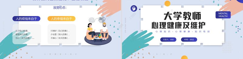 大學教師心理健康及維護MENTAL HEALTH 心理知識-心理健康-知識培訓主講人:XXX時間:2022心/理/健/康/及/維/護MENTAL HEALTH AND