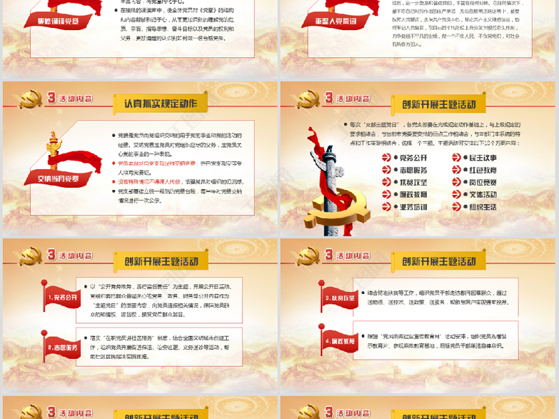 以“公開黨務政務,履行監督責任”為主題,開展公開日活動。黨組織要把群眾普遍關心的黨務、政務、財務等公開內容作為“主題黨日”的重要內容,向黨員通報相關情況,保障黨員群眾的知情權、監督權,接受黨員群眾監督。活動內容3落實“在職黨員進社區服務”制度,結合全國文明城市創建工作,組織黨員開展街道保潔、治安巡邏、義務送診等活動,幫助社區居民解決實際困難。創新開展主題活動