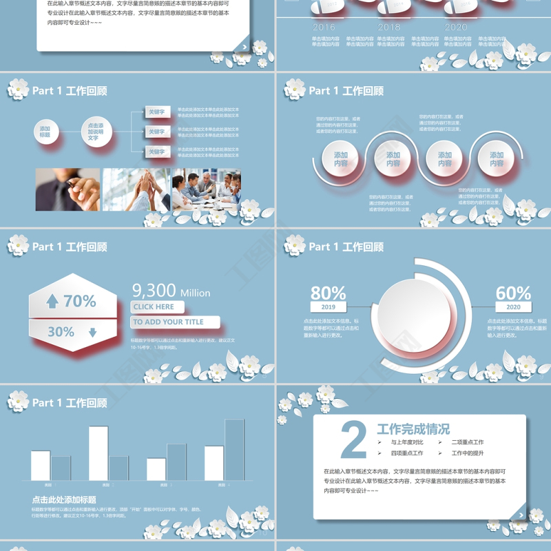 Part 1 工作回顧標題數字等都可以通過點擊和重新輸入進行更改,建議正文10-16號字,1.3倍字間距。CLICK HERETO ADD YOUR TITLE9,300Million8延時符