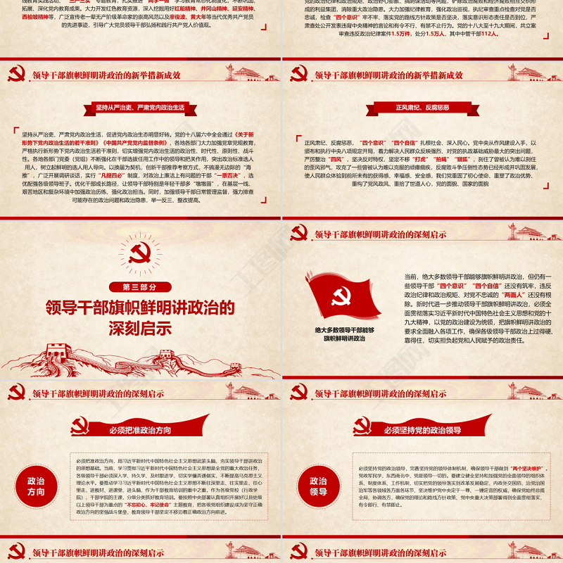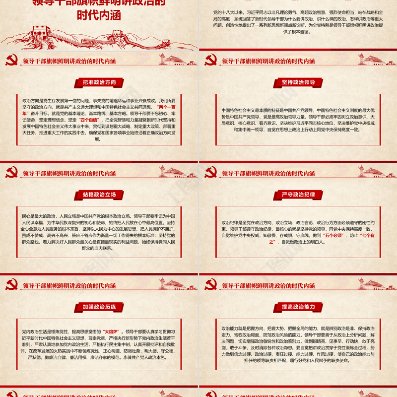 工圖網(wǎng)提供原創(chuàng)新時(shí)代領(lǐng)導(dǎo)干部必須旗幟鮮明講政治黨建PPT供會(huì)員免費(fèi)下載。更多精彩黨課PPT素材,盡在工圖網(wǎng)。