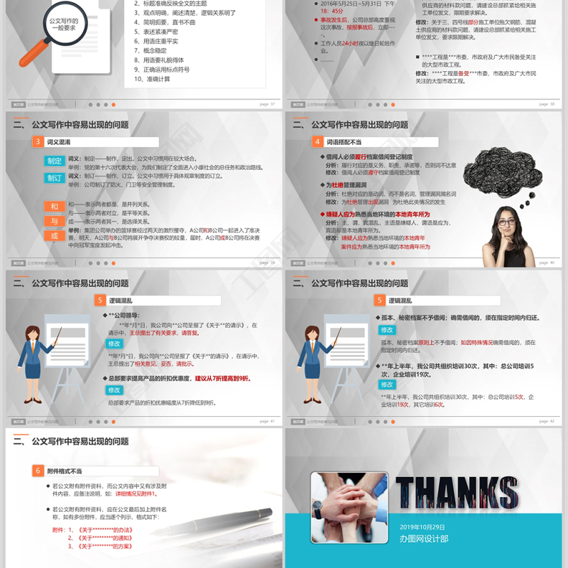 二、 公文寫作中容易出現(xiàn)的問題邏輯混亂5孤本、秘密檔案不予借閱;確需借閱的,須在指定時間內(nèi)歸還。修改孤本、秘密檔案原則上不予借閱;如因特殊情況確需借閱的,須在指定時間內(nèi)歸還。**年上半年,我公司共組織培訓(xùn)30次,其中:總公司培訓(xùn)5次,企業(yè)培訓(xùn)19次。修改**年上半年,我公司共組織培訓(xùn)30次,其中:總公司培訓(xùn)5次,企業(yè)培訓(xùn)19次,其它培訓(xùn)6次。