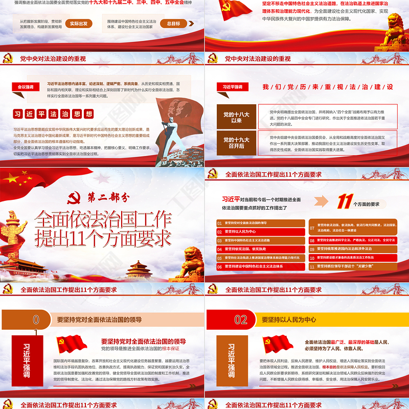 要堅持全面推進科學立法、嚴格執法、公正司法、全民守法。08要繼續推進法治領域改革,解決好立法、執法、司法、守法等領域的突出矛盾和問題。公平正義是司法的靈魂和生命。要深化司法責任制綜合配套改革,加強司法制約監督,健全社會公平正義法治保障制度,努力讓人民群眾在每一個司法案件中感受到公平正義。要加快構建規范高效的制約監督體系。要推動掃黑除惡常態化,堅決打擊黑惡勢力及其“保護傘”,讓城鄉更安寧、群眾更安樂。指出公平正義是司法的靈魂和生命。全面依法治國工作提出11個方面要求