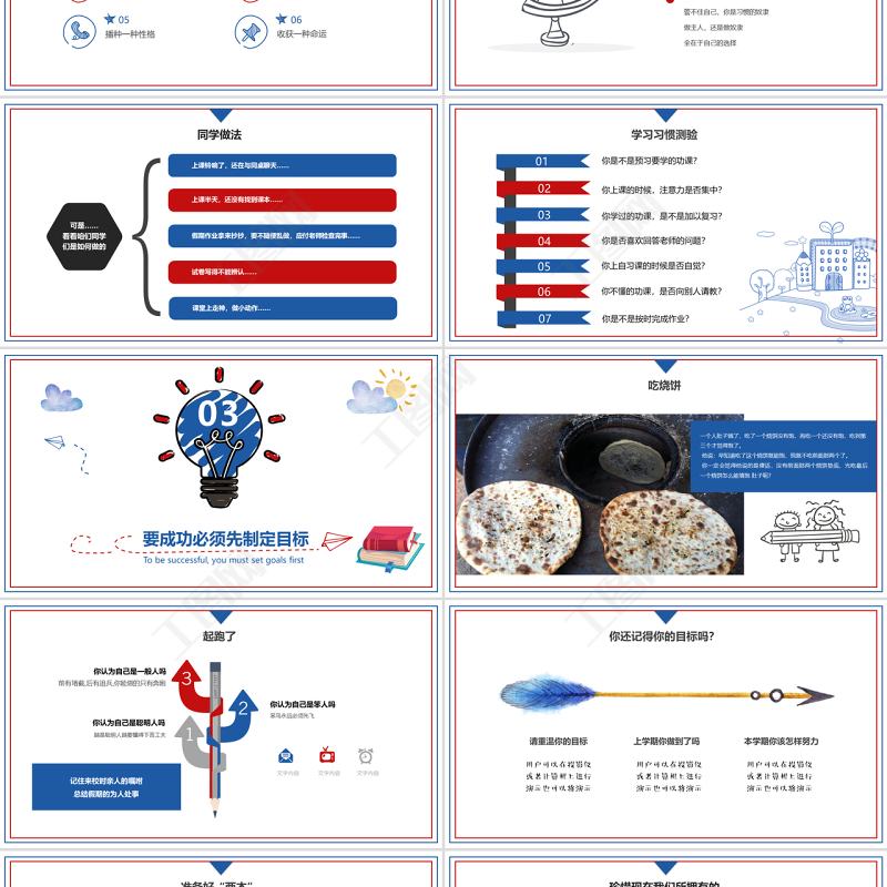 <p>開學第一課簡約課堂教育PPTHow does the classroom accept the heart</p><br><p>相信自己,我們可以更優秀</p><br><p>好的開始是成功的一半A good beginning is half done成功的基礎在于好的習慣The foundation of success lies in good habits本次班會總結This class meeting concludes要成功必須先制定目標To be successful, you must set goals first</p><br><p>好的開始是成功的一半01A good beginning is half done</p><br><p></p><br><p>關于刻苦和堅持 開學第一天,古希臘大哲學家蘇格拉底對學生們說:“今天我們只學一件最簡單也是最容易做的事兒。每人把胳膊盡量往前甩,然后再盡量往后甩。”說完,蘇格拉底示范了一遍。“從今天開始,每天做300下。大家能做到嗎?” 學生們都笑了。這么簡單的事,有什么做不到的?過了一個月,蘇格拉底問學生們:“每天甩手300下,哪些同學堅持了?”有90%的同學驕傲地舉起了手。 又過了一個月,蘇格拉底又問,這回,堅持下來的學生只剩下八成。 一年過后,蘇格拉底再一次問大家:“請告訴我,最簡單的甩手運動,還有哪幾位同學堅持了?”這時,整個教室里,只有一人舉起了手。這個學生就是后來成為古希臘另一位大哲學家的柏拉圖。 正如古人所說:鍥而不舍、金石可鏤;鍥而舍之,朽木不折。只要我們對自己嚴格要求,堅持不懈,成功就會屬于我們! </p><br><p>怎樣有一個好的開端呢</p><br><p>成功的基礎在于好的習慣02The foundation of success lies in good habits</p><br><p>溫馨提示習慣是一個人的資本,你有了好習慣,你一輩子都有用不完的利息,你有了壞習慣,你一輩子有償還不了的債務。</p><br><p>良好習慣大家學從小到大,你有什么“好習慣”曾讓你倍受贊賞、取得小勝利或取得一些事情上的成功?給同學們說說,大家來分享、學習一下……</p><br><p>這些習慣你有嗎</p><br><p>你對以下習慣有什么看法—— 在思考問題時經常一邊旋筆一邊思考0504030201—— 在學習中遇到問題題后,習慣先放一邊, 以后又忘了解決。—— 考試考差了后,開始下定決心認真學習,但幾天后又松懈了。—— 邊聽音樂邊做作業—— 自制力差,時間安排不合理,利用率不高……</p><br><p>想一想自習課抬頭率翻書包率說廢話率討論問題率看與功課無關書籍率無故發呆率鈴響按時安靜率?</p><br><p>理想的聽課習慣就是聽課的時候,不僅注意黑板上老師寫的內容,還要注意老師的表情、口型等,要靈活地根據實際情境運用。一般的情況下,口到有三個需要:一是朗讀需要;二是記憶需要;三是隨時發問。老師講課的時候,只是起個引導的作用,最主要的還是靠自己思考,這就要求在聽課的時候時刻都要用心。就是我們在認真聽課,積極思考的同時,要做好課堂筆記。</p><br><p>人格化好習慣的12個指標</p><br><p>改掉壞習慣的方法</p><br><p>向不良的習慣SAY NO 昨日的習慣,已經造就了今日的我們;今日的習慣,決定明天的我們。好習慣,益終生!</p><br><p>行為和習慣</p><br><p>管住自己不長記性,總是重復在同一個錯誤里原諒自己,在沒有辦法改變的時候就放棄了,然后給自己找各種各樣的理由意志薄弱,下決心要控制自己,可是總是在最后的關頭又堅持不住了管得住自己,你是習慣的主人管不住自己,你是習慣的奴隸做主人,還是做奴隸全在于自己的選擇</p><br><p>同學做法可是……看看咱們同學們是如何做的上課鈴響了,還在與同桌聊天……上課半天,還沒有找到課本……假期作業拿來抄抄,要不隨便亂做,應付老師檢查完事……試卷寫得不能辨認……課堂上走神,做小動作……</p><br><p>學習習慣測驗你是不是預習要學的功課?01你上課的時候,注意力是否集中?02你學過的功課,是不是加以復習?03你是否喜歡回答老師的問題?04你是不是按時完成作業?07你上自習課的時候是否自覺?05你不懂的功課,是否向別人請教?06</p><br><p>要成功必須先制定目標03To be successful, you must set goals first</p><br><p>吃燒餅一個人肚子餓了,吃了一個燒餅沒有飽,再吃一個還沒有飽,吃到第三個才覺得飽了。?他說:早知道吃了這個燒餅就能飽,我就不吃前面那兩個了。 你一定會覺得他說的是傻話,沒有前面那兩個燒餅墊底,光吃最后一個燒餅怎么能填飽 肚子呢? </p><br><p>起跑了文字內容文字內容文字內容</p><br><p>你還記得你的目標嗎?用戶可以在投影儀或者計算機上進行演示也可以將演示用戶可以在投影儀或者計算機上進行演示也可以將演示用戶可以在投影儀或者計算機上進行演示也可以將演示請重溫你的目標上學期你做到了嗎本學期你該怎樣努力</p><br><p>準備好“兩本”準備好“兩本”,即計算本和改錯本。</p><br><p>珍惜現在我們所擁有的</p><br><p>本次班會總結04This class meeting concludes</p><br><p>總結明確目標-----爭當優秀集體培養二風------優良的班風、濃厚的學風樹立三感------榮譽感、責任感、競爭感四有四嚴------有理想、有道德、有文化、有紀律、嚴格要求、嚴格訓練、嚴格管理、嚴格把關五字班訓 敬:尊敬老師、尊敬父母、尊敬同學。 競:開展競賽、比學趕幫、力爭上游。 靜:安心安靜、遵規守紀、專心學習。 凈:環境衛生、衣著整潔、言行文明。 晶:全面發展、保持全優、合格成才。提高六能力 --自學能力、記憶能力、想象能組織能力、表達能力、創造能力;學習七認真 --學習態度認真、課前預習認真、課中聽講認真、課后作業認真、筆記書寫認真、消化鞏固認真、測驗考核認真。常規八戒--戒