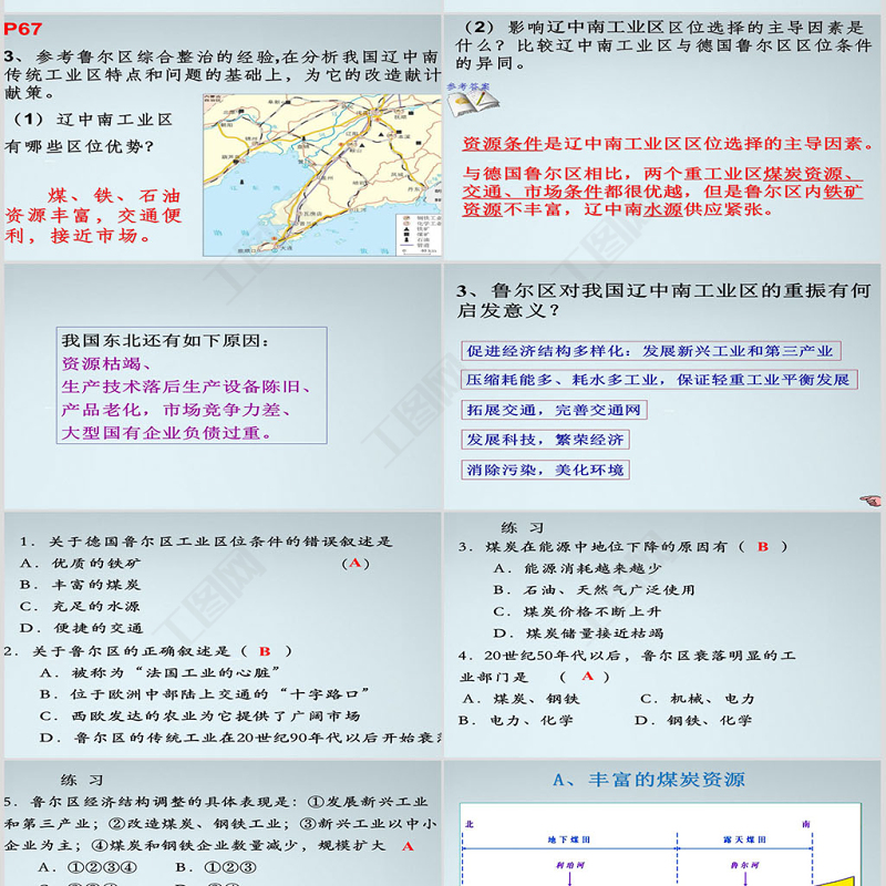 3、魯爾區對我國遼中南工業區的重振有何啟發意義?促進經濟結構多樣化:發展新興工業和第三產業壓縮耗能多、耗水多工業,保證輕重工業平衡發展拓展交通,完善交通網發展科技,繁榮經濟消除污染,美化環境