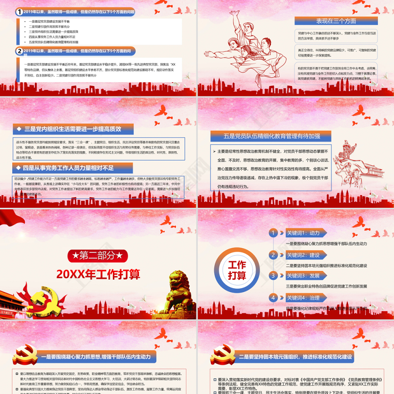 紅色簡約黨政黨支部工作計劃總結PPT模板 年度工作總結 新年工作計劃 工作報告 工作總結 商務PPT 述職報告 總結匯報 大氣 工作總結 年終總結PPT 動態PPT模板 工作匯報 年中總結 半年總結 個人總結 部門工作總結,月度總結 季度工作總結 工作計劃 工作述職報告 工作匯報 Array