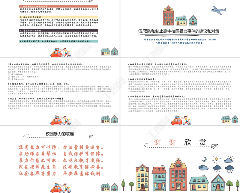 校園暴力可以防,方法掌握要適當。求助師長來幫忙,自我保護有保障。暴力行為不可取,文明禮貌才更強。家長老師是主角,法制教育很必要。社會各界齊努力,平安校園你我創