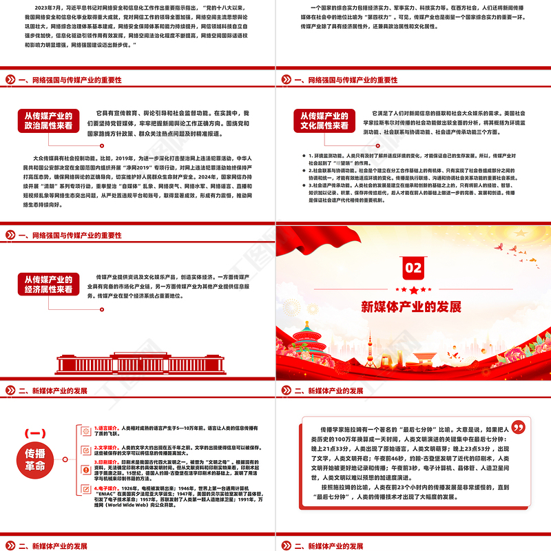 建設網絡強國是筑牢國家網絡安全的重要保障。2014年2月,習近平總書記主持召開中央網絡安全和信息化領導小組第一次會議時指出,“努力把我國建設成為網絡強國”。一、網絡強國與傳媒產業的重要性 2023年7月,習近平總書記對網絡安全和信息化工作作出重要指示指出,“黨的十八大以來,我國網絡安全和信息化事業取得重大成就,黨對網信工作的領導全面加強,網絡空間主流思想輿論鞏固壯大,網絡綜合治理體系基本建成,網絡安全保障體系和能力持續提升,網信領域科技自立自強步伐加快,信息化驅動引領作用有效發揮,網絡空間法治化程度不斷提高,網絡空間國際話語權和影響力明顯增強,網絡強國建設邁出新步伐。”